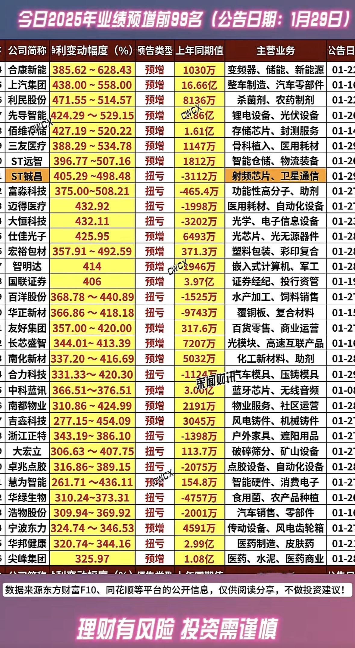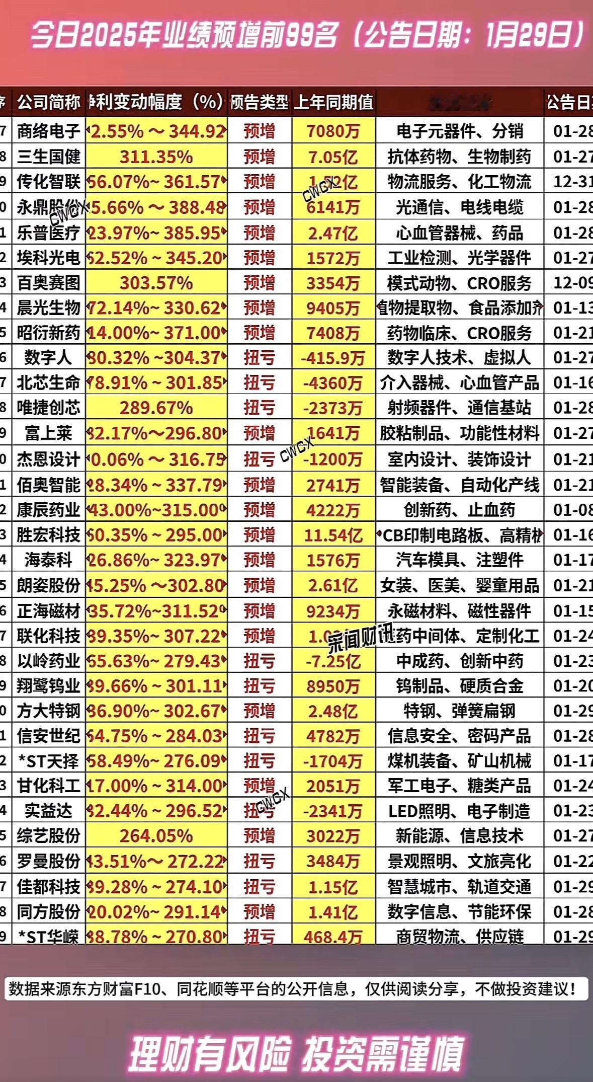 2025年业绩预增前99名公司揭晓,快来一睹为快! 业绩预增榜出炉!生物制药、风电轴承、智慧城市领跑,环保、芯片测试扭亏为盈,新能源与科技板块表现亮眼。