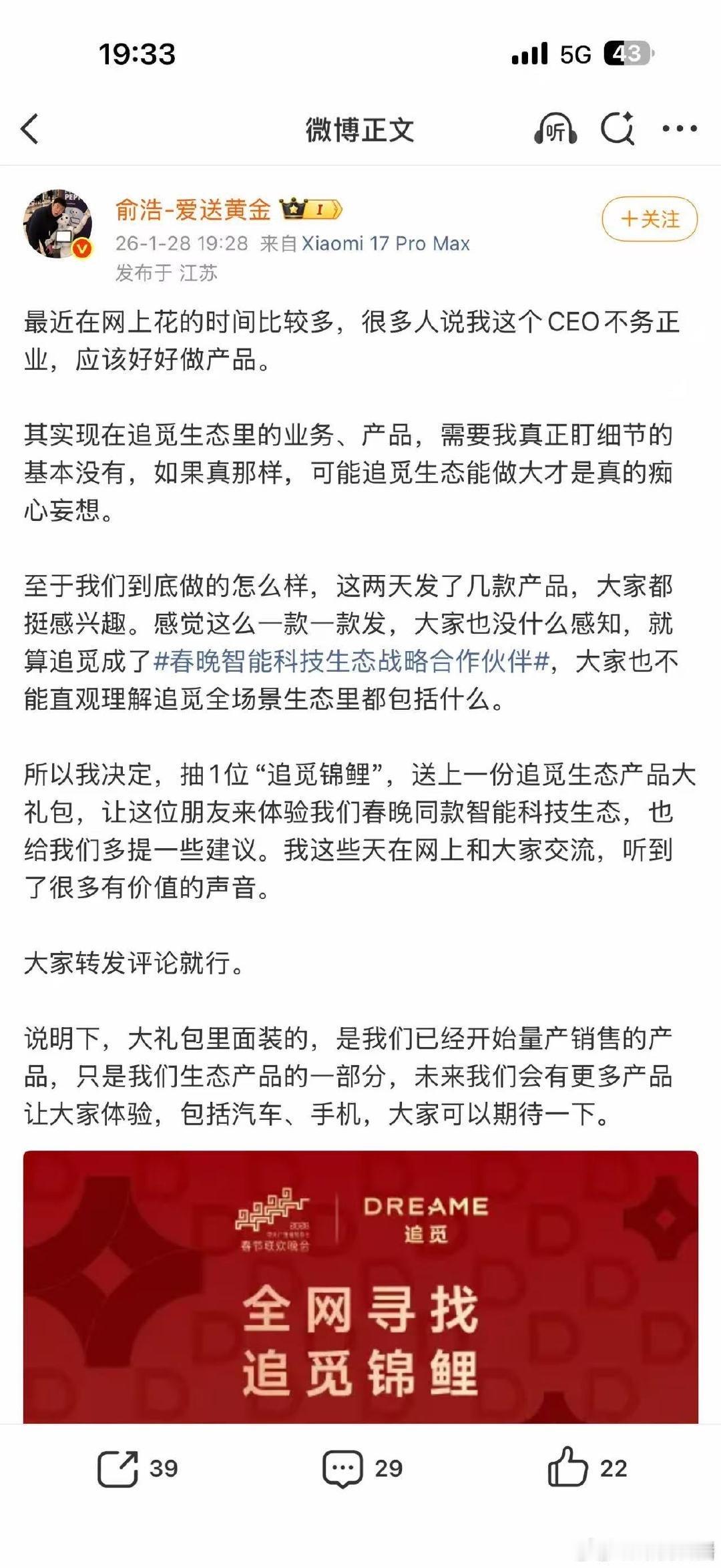追觅ceo送春晚同款生态产品新年福利重磅来袭!追觅CEO俞浩实力宠粉,直接送出春晚同款全生态产品,从清洁黑科技到奢护家电全覆盖,把春晚舞台上的硬核科技搬进千家万户,这份新年惊喜直接拉满!俞浩送追觅春晚同款全生态产品