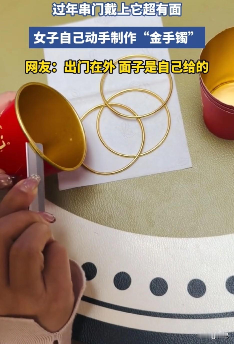 人怎么可以这么聪明? 金价飙升,买不起金手镯,女子决定自己动手制作“金手镯”。 0.5元的金箔一次性纸杯来四个,用小刀小心翼翼沿着边缘割下来,一个完整的“金手镯”就这么诞生了。 不仔细看,跟金手镯真的很像。只要你一口咬定是金手镯,谁敢说不是,毕竟出门在外,面子是自己给的。一只手四个,一下子成富婆了,戴上过年串门超有面子的。 太聪明了!只是千万别把手插在兜里,不要碰水,不然掉色了,压扁了就露馅了。