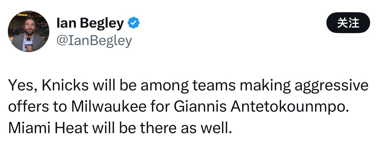 Ian Begley:尼克斯和热火将为字母哥开出极具竞争力的报价。据此前Shams报道,字母哥将离开雄鹿。