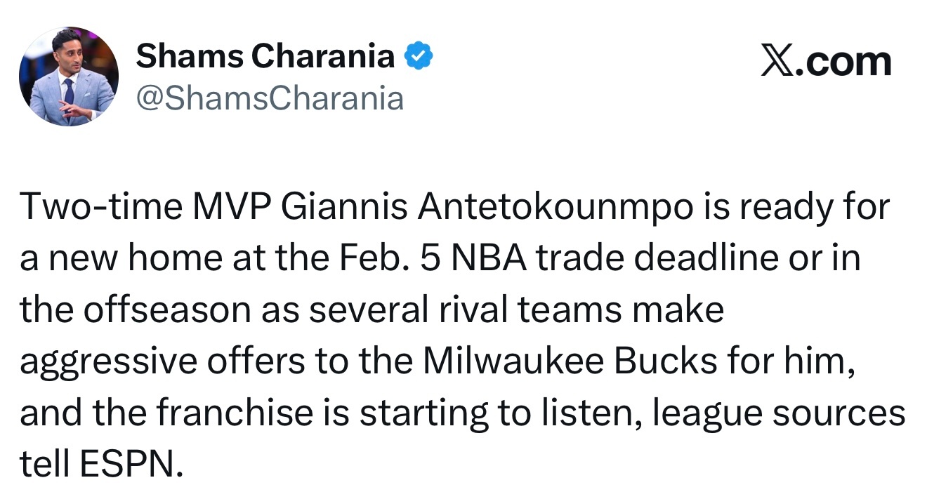 Shams:字母哥将会离开雄鹿!安特托昆博准备在2月5日NBA交易截止日期前或休