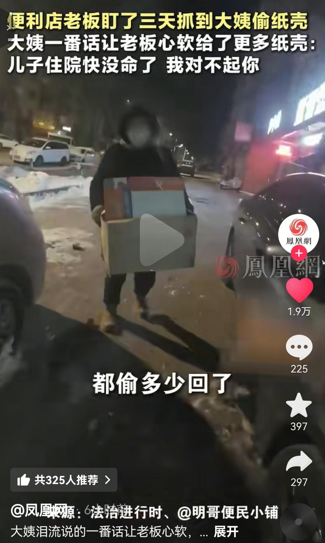 看哭了!真的是可怜天下父母心呐!近日,黑龙江哈尔滨一家便利店门口来了一位大姨,大姨没有跟商家打招呼,看到门口有纸箱子,偷摸地就拿走了。 大姨刚要拿着纸箱子转身离开,就被老板叫住了,只见老板说:“大姨,你别走,你都偷多少回了!” 我当时心里还咯噔一下,以为两个人会为这件事发生争吵呢? 可大姨的回答,却让老板的火气瞬间停熄了。 她低着头,声音抖得不成样子,手里的纸壳箱都快抱不住了:“我儿子在医大呢,快没命了……我没办法啊,对不起,对不起……” 说着说着,她还对着老板深深鞠了一躬,以表达自己的歉意,嘴里反复念叨着“不好意思”。 老板盯着她看了几秒,语气一下子软了下来,转身就往店里走:“再给你拿点来。”不一会儿,他抱出了更多纸箱子,一股脑塞到大姨怀里:“给你吧阿姨,都给你。” 大姨抱着怀里的纸箱子,一边抹眼泪一边对着老板的背影说:“祝你发财。” 她甚至还对着老板轻声说了句“对不起,孩子啊”。 此事传到了网上,有的网友说:“ 这才是人间烟火气啊,老板心善,大姨有骨气,看得鼻子酸酸的。” 还有的网友说:“谁的生活容易啊,老板知道大姨的难处,没揪着不放,反而给更多呢纸箱子,虽然微不足道,但是,仅凭这一点就赢了所有人。” 老板看到自家的纸箱子被偷了,不是没脾气,要不然,他盯着监控看了三天,本来就是为了抓“小偷”的,但当他看见大姨冻得通红的手,听见那句“我没办法”,所有的计较都没有了。 他没说什么大道理,只是把能给的温暖,都递了过去。 而大姨呢,她明明是在“偷”,却把腰弯得最低,一遍遍地说“对不起”。她不是想占小便宜,是为了躺在病床上的儿子,不得不放下尊严。 我们总说“人间自有真情在”,可真正的真情,从来不是惊天动地的壮举,而是普通人在难处里,给彼此留的那一点余地。 老板没因为被“偷”而愤怒,大姨没因为被抓而撒泼,两个陌生人在寒冷的寒夜里,用最朴素的方式,守住了各自的善良。   我们总在抱怨生活太难,可在这难里,总有一些人在用行动告诉我们:别冷了心,别丢了善良。你今天给别人的一点暖,说不定就是别人撑过冬天的光。 针对此事,你有什么看法呢?欢迎大家评论区讨论。