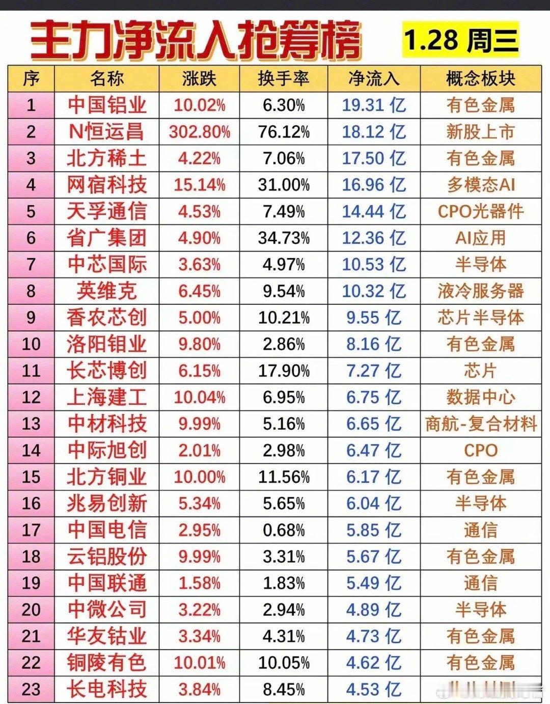 1.28周三 主力大资金 净流入抢筹榜!贵金属,存储芯片,化工原料,环氧丙烷半导体,油气开采,农业板块等,获得资金关注。医药,生物疫苗,电源设备,生物制品,食品饮料美容护理等资金出逃今日看盘a股上证指数