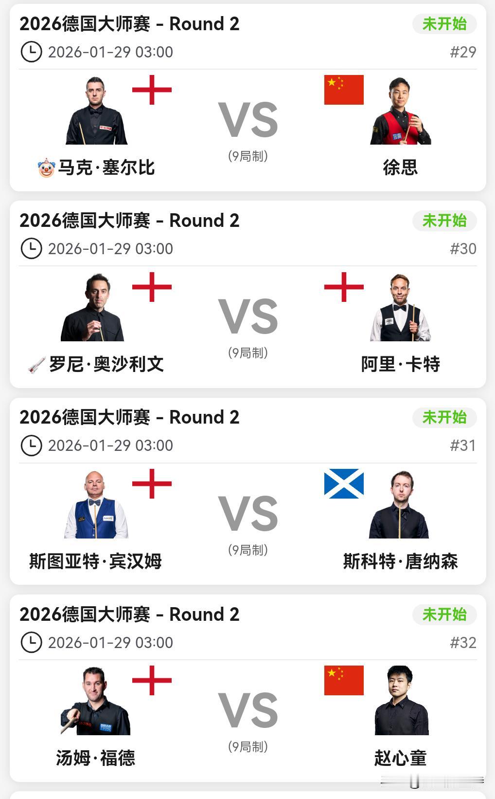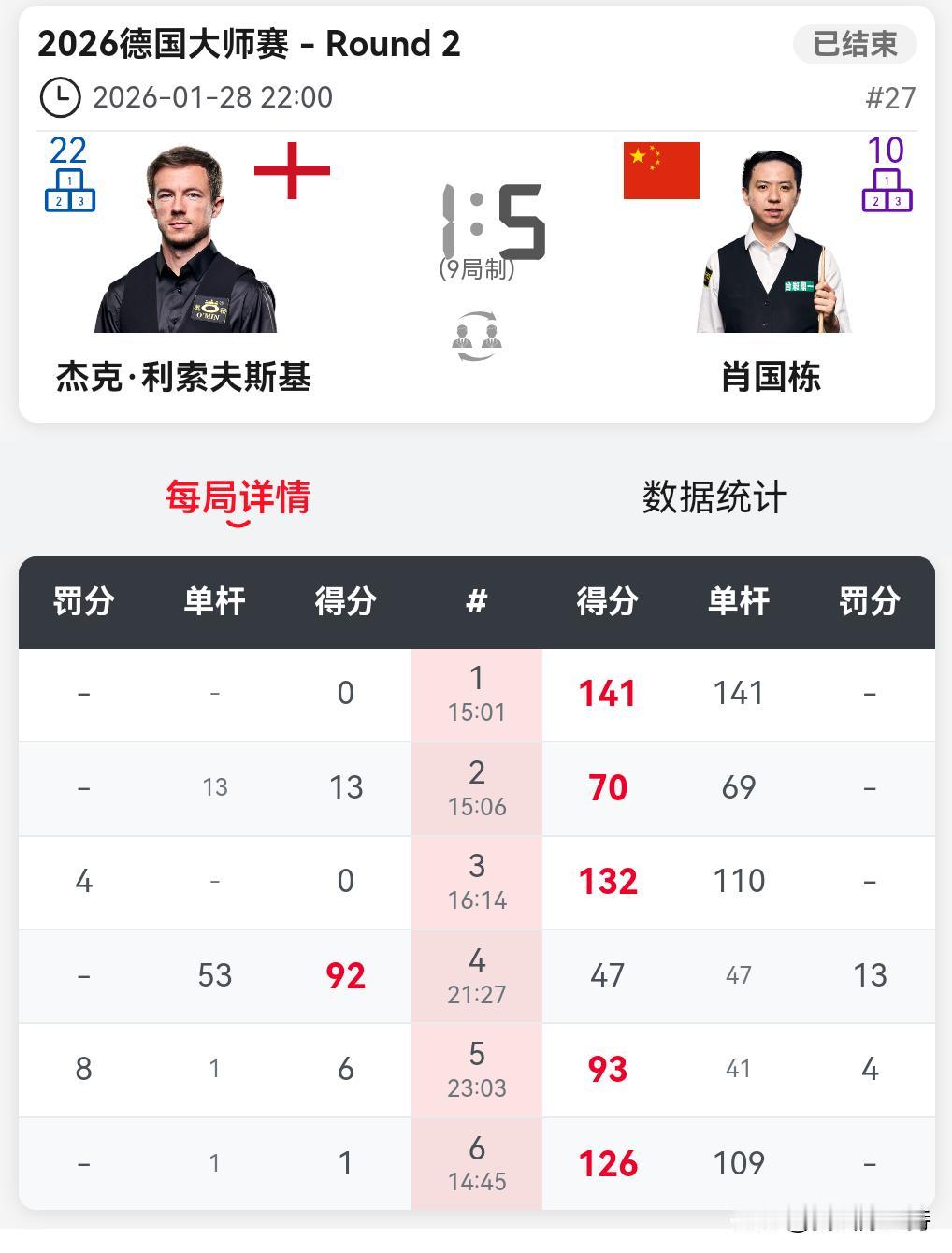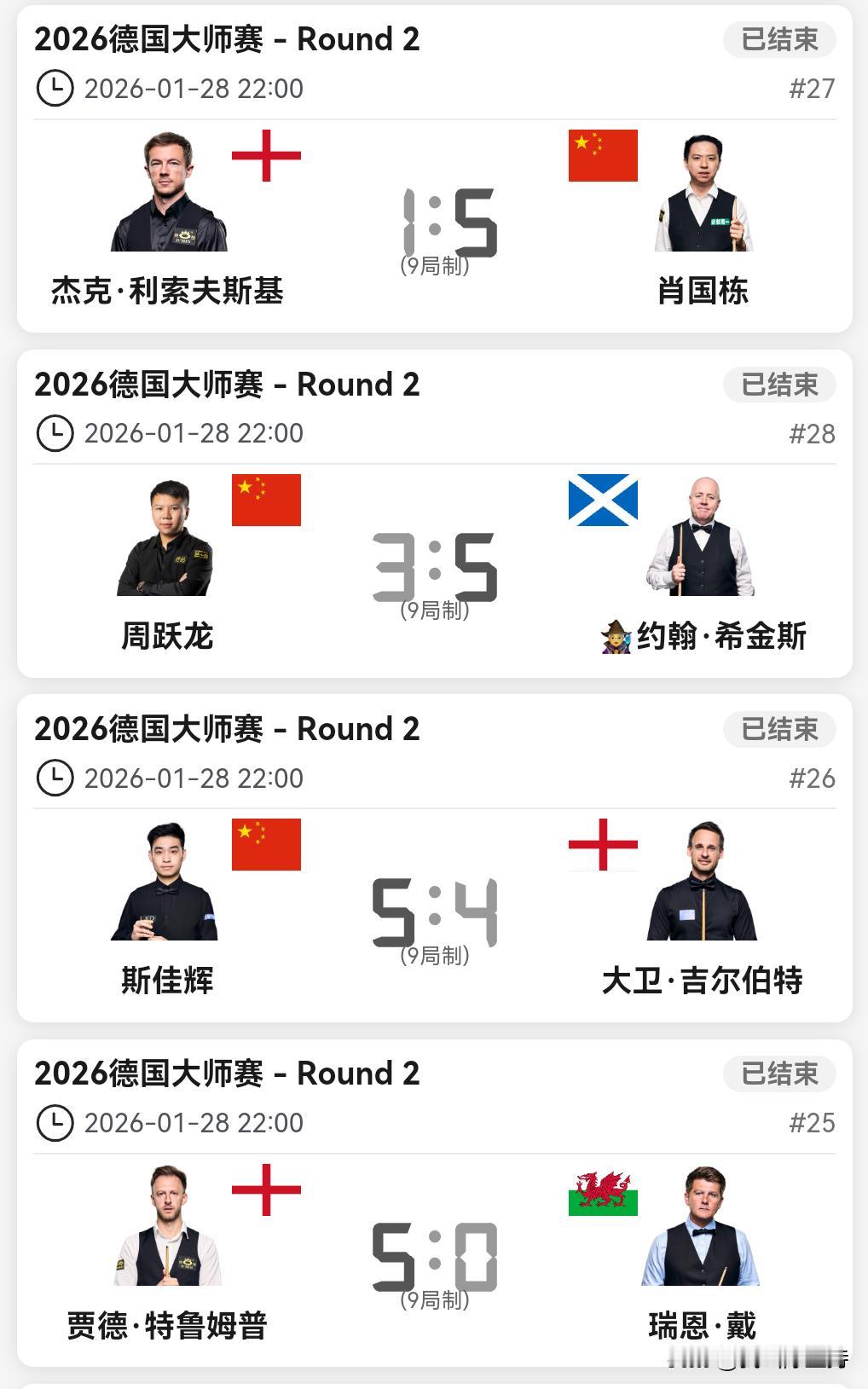 德国大师赛,斯佳辉决胜局展示大心脏,5-4击败吉尔伯特进入16强。 进攻端斯佳辉还不错,防守端差一些,但是吉尔伯特给了斯佳辉一些机会,斯佳辉也把握了,恭喜斯佳辉晋级。下一轮斯佳辉对阵特鲁姆普,难度是地狱级。 肖国栋5-1击败利索夫斯基,相对轻松,小司机失误多。下一轮对手是希金斯,这一场还看值得一看。 周跃龙不敌希金斯,2-0领先,3-5落败,还是老问题,玻璃心。 张安达打出147,击败霍金斯,下一轮对手是风头正劲的凯伦威尔逊,难度也很大,不过张安达近期手感不错,可以打一打。 一会赵心童、徐思等出场。 期待中国球员好运。