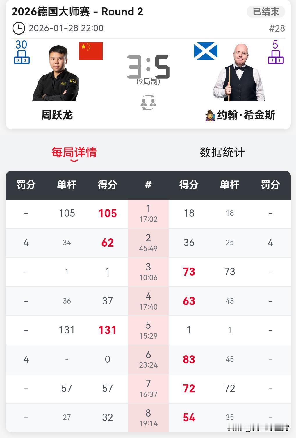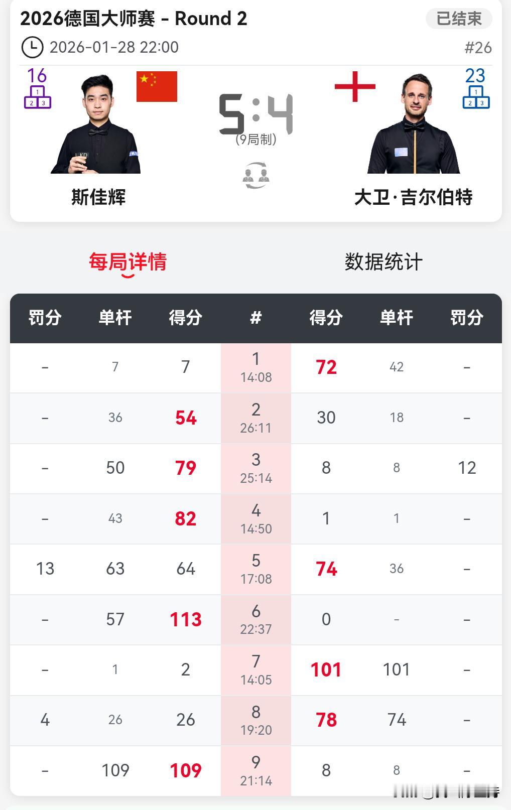 德国大师赛,斯佳辉决胜局展示大心脏,5-4击败吉尔伯特进入16强。 进攻端斯佳辉