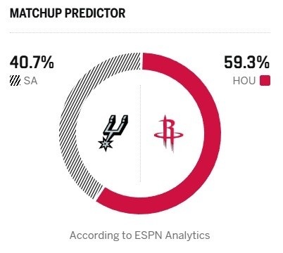 🤔西部第二VS第四焦点战!ESPN预测明日胜率:马刺40.7%火箭59.3%