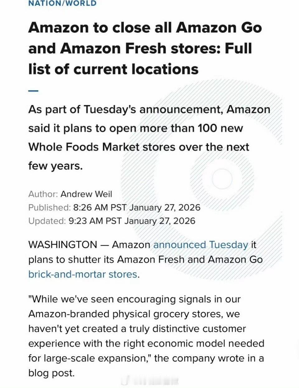 亚马逊最近动作频频,先是裁员16000人,然后又准备关掉所有无人便利店和亚马逊生鲜线下门店,部分门店将改造为全食超市。即裁员又关店,这是要提高单个店的营销额和单个员工的销售额吧。