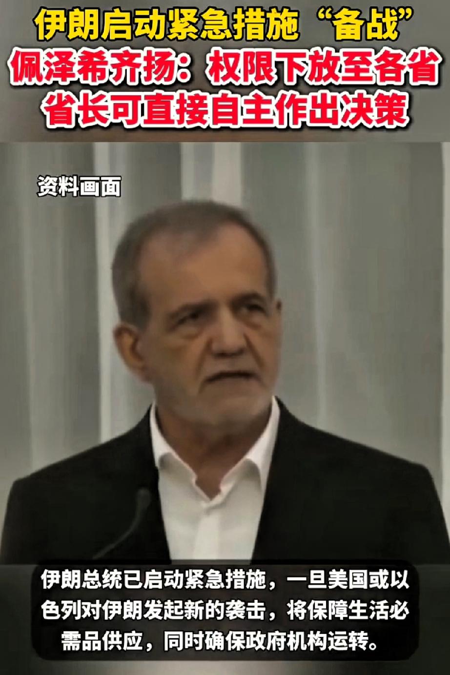伊朗已为最坏的情况做好了准备, 但这可不是什么悲情的“最后时刻”,而是一次精明的“权力下放”! 佩泽希齐扬这招挺绝:直接把决策权扔给各省省长。 啥意思?就是告诉地方:“别等德黑兰的电话了,真要打起来,省里自己就能拍板!” 这招明显是为防美军的“斩首”战术。 要是中央指挥部一锅端了,各省立马能变身几十个独立作战单元,想一锅端死伊朗? 难了!同时,这也省去了中间层层汇报的繁琐,战时效率直接拉满。 航母大军压境是吧? 伊朗直接祭出“全民皆兵、多线指挥”的阵势。 这哪是被动挨打,分明是把国家变成了一盘散不了、打不烂的“九头蛇”。 硬碰硬或许不是目的,但这股子“随时能跟你耗到底”的狠劲儿,特朗普团队是不是也得掂量掂量?