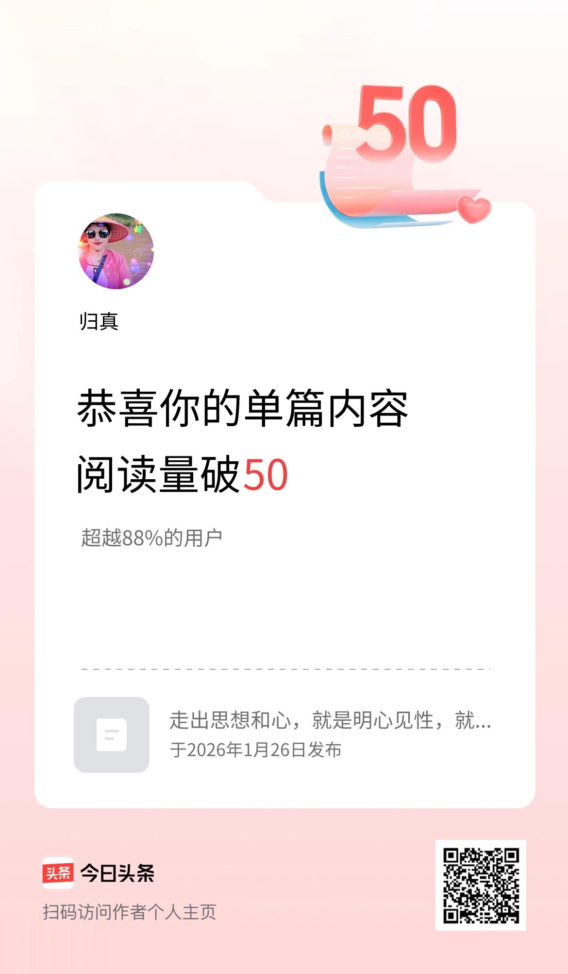 单篇内容获得阅读量破50啦!每次用心的点点滴滴,小小的成绩来自日积月累。努力,坚持,加油,功夫不负有心人❤️🌹
