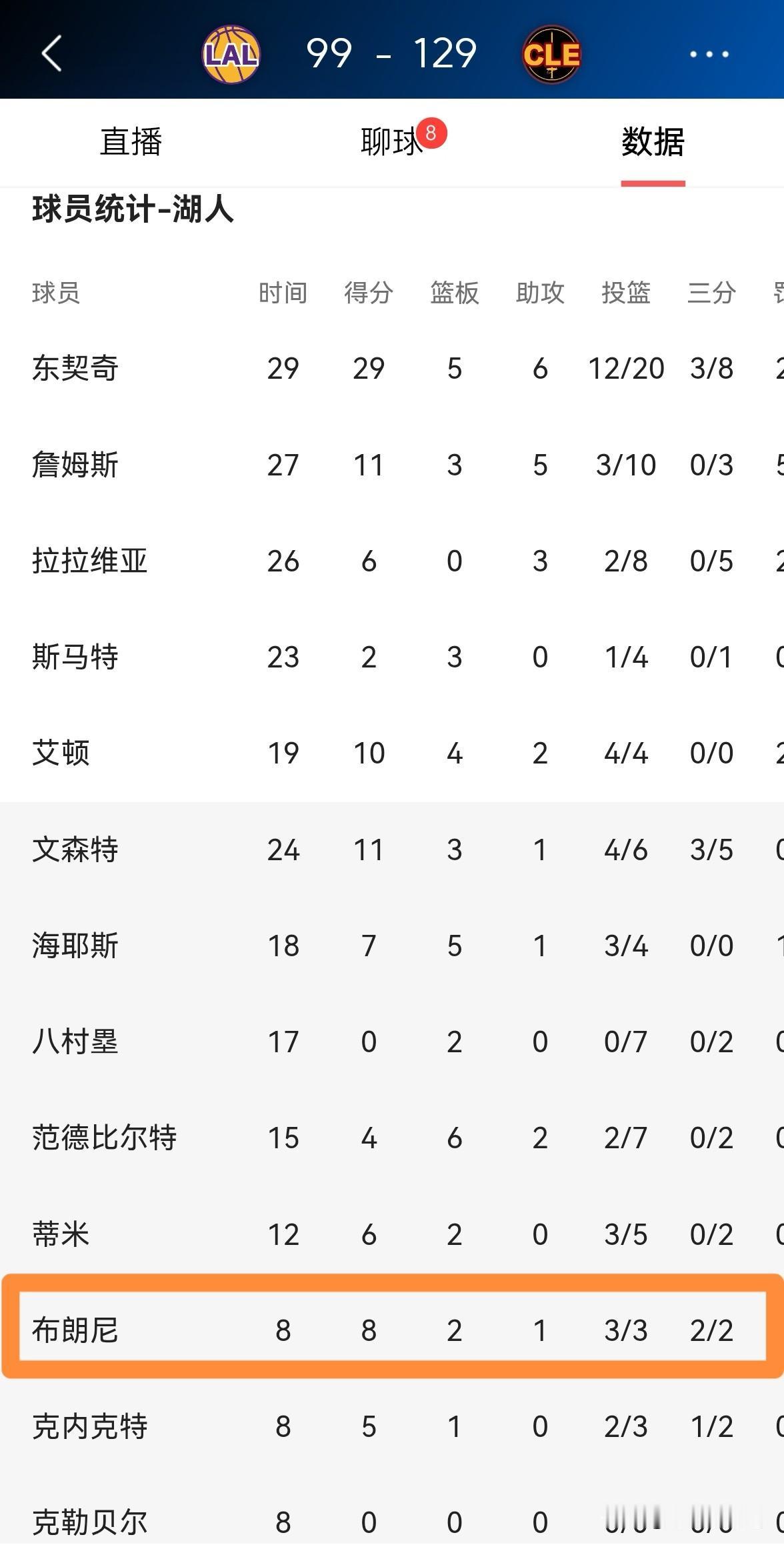 湖人小将布朗尼的得分效率真是高的吓人!虽然今天湖人在客场以99:129惨败于骑士,但是布朗尼在有限的出场时间里却打出了极高的得分效率。 整场比赛下来,布朗尼替补出战8分钟,投篮3中3,其中三分球2中2非常高效的砍下8分,还有2篮板1助攻1抢断,他的场上正负值为-1。 湖人主帅雷迪克真是有眼无珠,像布朗尼这么出色的得分手竟然进不了球队的轮换阵容,真是岂有此理。