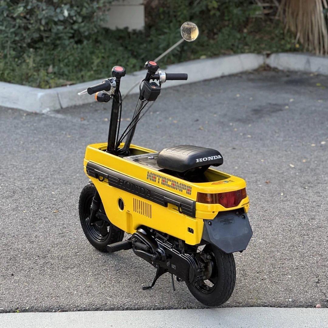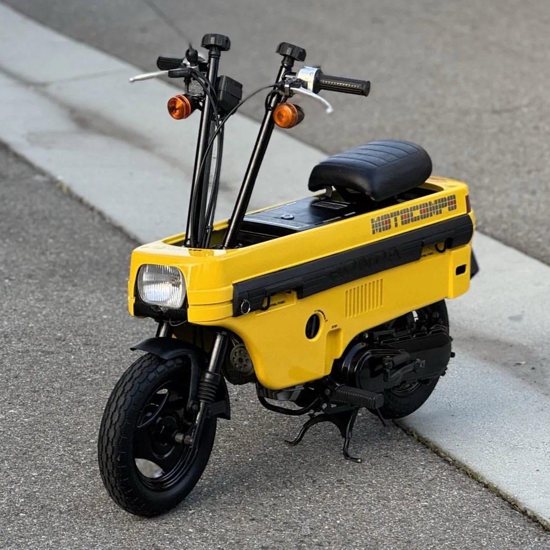 1982 年的 Honda Motocompo 是那个把“折叠与机动”玩成艺术品的城市偶像——本田在 1981 年为新推出的微型掀背 Honda City 量身打造了这款可折叠的小型踏板车,作为“后备箱摩托”同步上市,体现出八零年代日本对城市通勤与生活方式的前瞻思考与工业美学。 它搭载一台 49cc 空冷二冲程单缸发动机,额定约 2.5 马力,单速自动离合,整车干重约 92 磅(≈42 公斤),展开时车长约 1,184 mm、宽约 536 mm,最高时速约 25 英里/小时(约 40 km/h 的城市实用区间),这些看似谦逊的数据正是其魅力所在——小巧、轻便、可随车收纳。 在那个信奉“功能即美学”的年代,Motocompo 把玩具感与工程师的克制融合:把把手、座椅与脚踏收拢后变成一只矩形箱体,既是设计声明,也是生活方式主张。它并非为速度而生,而是为解决“最后一公里”和城市收纳焦虑而来,这种为场景而造车的思路,今天看仍然前卫。 本田摩托 经典老车 玩车日常 晒出你的爱车