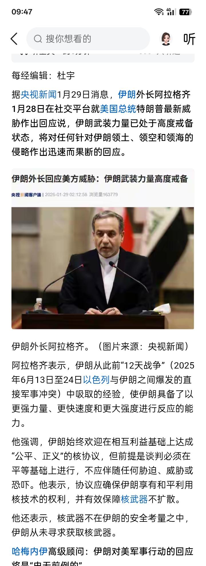 战争的危机再上一级? 一向比较温和的伊朗外交部长阿拉格齐,对于美国的步步紧逼的军
