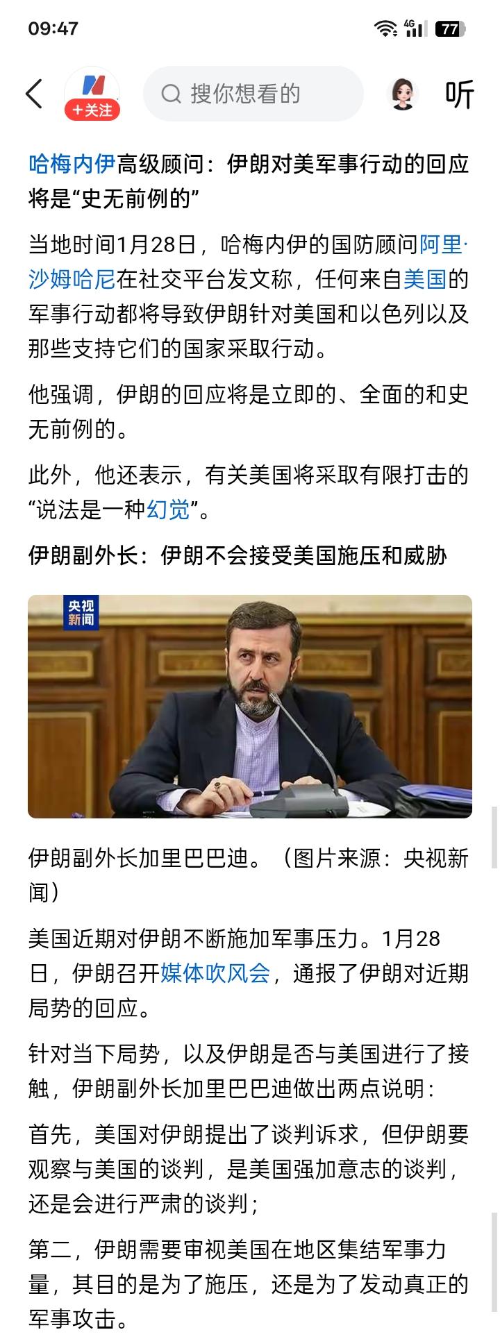 战争的危机再上一级? 一向比较温和的伊朗外交部长阿拉格齐,对于美国的步步紧逼的军事威胁,以及不停的战争叫嚣,在1月28日表示:伊朗武装力量已经处于高度戒备状态,将对任何对伊朗领土、领空和领海的侵略行动,作出迅速而果断的回击。 与此同时,伊朗外交部副部长加里巴巴迪也表示,美国实际上并不可信任,伊朗也不会接受美国的军事威胁和各种施压,以及各种各样的威逼利诱,伊朗目前的任务是做好“200%的自卫准备”。 看来,好像特朗普的大棒并没有吓倒上层伊朗人的抵抗意志和决心,反倒让他们更加一致。就是不知道美国总统特朗普,究竟有没有胆量真的对伊朗采取军事行动。