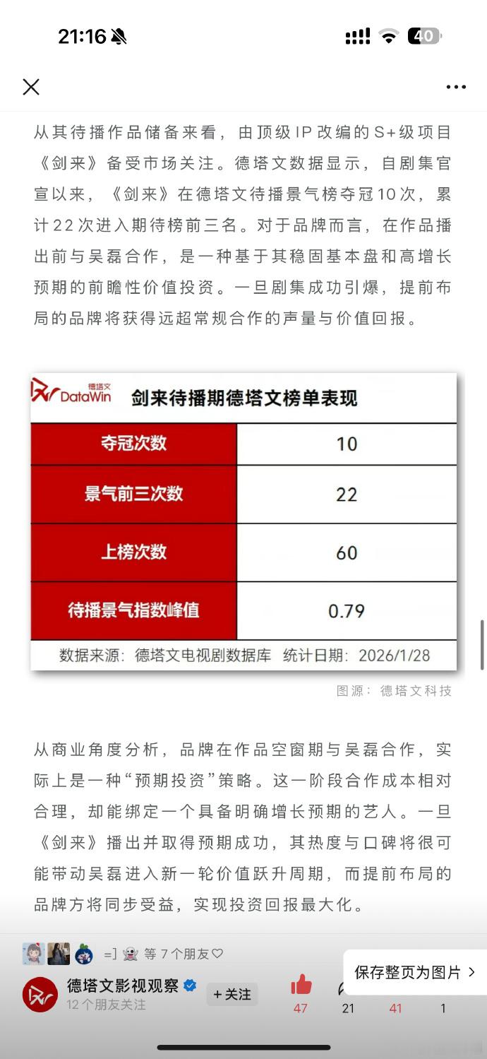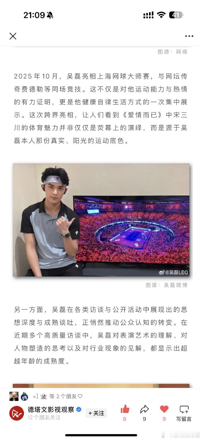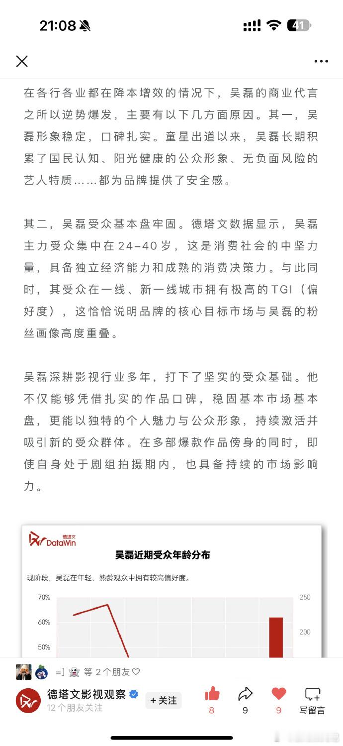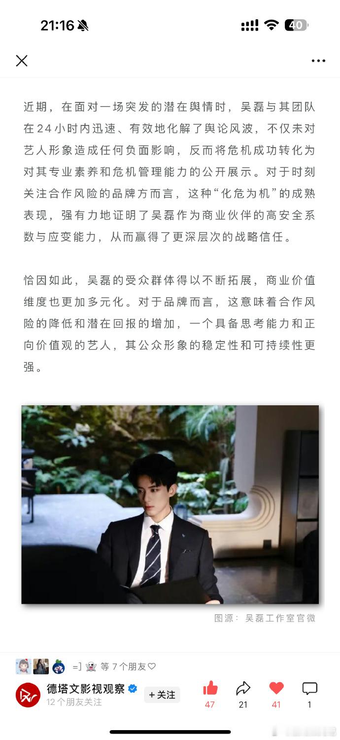 媒体评吴磊逆势爆发德塔文长文评价吴磊处于逆势爆发,打破商业代言依赖作品的常规,在作品空窗期也能商业价值持续增长,吴磊实力恐怖如斯。