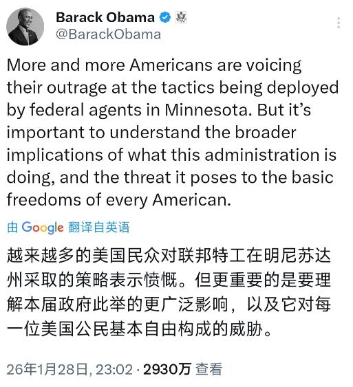 美国前总统奥巴马昨晚(北京时间1月28日晚)发文写道:“越来越多的美国民众对联邦特工在明尼苏达州采取的策略表示愤慨。但更重要的是要理解本届政府此举的更广泛影响,以及它对每一位美国公民基本自由构成的威胁。”   奥巴马这番话绝非空穴来风,背后是明尼苏达州近期愈演愈烈的联邦执法争议,事儿闹到现在,早已不是简单的移民执法那么简单,每一步发展都牵扯着美国民众的神经,也让联邦政府和地方政府的矛盾彻底摆上了台面。   熟悉情况的人都清楚,从去年12月开始,联邦政府就启动了针对明尼苏达州的大规模移民执法行动,还给这场行动起了个代号,前后总共派出了近3000名联邦执法人员,里头既有移民与海关执法局的人,也有边境巡逻队的特工,规模之大,创下了美国联邦政府移民执法的纪录。   本来这场行动打着“打击非法移民、清除严重犯罪分子”的旗号,可执行起来却变了味,执法人员的手段越来越强硬,甚至接连出现了致命枪击事件,短短三周时间里,就有两名美国公民在执法过程中被联邦特工开枪打死,这也是民众愤慨的核心原因。   最先出事的是1月7日,联邦执法人员在明尼阿波利斯市抓捕非法移民时,开枪打死了美国公民蕾恩·妮科尔·古德,这起事件直接点燃了民众的抗议情绪,全美多地都有民众走上街头,谴责联邦特工暴力执法,要求他们撤出明尼苏达州。   可抗议的声音还没平息,1月24日上午,明尼阿波利斯市又发生了一起枪击事件,37岁的美国籍急诊护士普雷蒂,在联邦特工执法时被当场打死,这起事件让本就紧张的局势雪上加霜,民众的不满彻底爆发,不少人直言,下一个受害者可能是任何人,联邦特工根本不尊重公民的生命安全。   更让民众无法接受的是,这两起枪击事件的真相都被层层掩盖,官方说法和民众看到的实情完全对不上。就说普雷蒂之死,联邦国土安全部一口咬定,普雷蒂当时持枪反抗,执法人员是出于自卫才开枪,可社交媒体上流传的视频却清晰显示,普雷蒂手里拿的只是手机,似乎正在拍摄执法过程,根本没有任何反抗举动。   更离谱的是,普雷蒂死后,明尼苏达州地方调查机构想要介入调查,却被联邦方面直接拒绝,哪怕他们拿到了法官签署的司法搜查令,也没能进入枪击现场,这种情况,就连明尼苏达州总检察长埃利森都表示,自己从业多年,从未遇到过这样的事。   其实早在这两起枪击事件之前,联邦特工的执法行为就已经引发了争议,1月16日,明尼苏达州一名联邦法官就曾发布命令,禁止联邦执法人员对和平抗议者使用催泪瓦斯、胡椒喷雾等武力,也不许随意逮捕旁观群众,可这份命令,似乎并没有被联邦特工放在眼里。   如今,明尼苏达州的抗议活动愈演愈烈,不光普通民众走上街头,就连美国的体育明星、议员都纷纷发声,谴责联邦政府的暴力执法。亚特兰大勇士队的明星投手斯宾塞·斯特莱德,特意发布了“波士顿惨案”的图片,以此类比当下的局势,暗指联邦特工的行为和当年欺压民众的英国士兵别无二致。   面对民众的愤慨和地方政府的反对,本届联邦政府非但没有收敛,反而还在硬撑。总统特朗普虽然表示,会让联邦特工的执法方式稍微放松一些,还指派了白宫官员接手相关事务,但他同时也强调,相关执法行动不会停止,未来甚至可能扩展到其他城市。   这也就是奥巴马发文担忧的原因,他看透了本届政府这种强硬执法背后的隐患,也清楚这种行为对美国公民基本自由的威胁。要知道,美国一直标榜“自由民主”,可现在,联邦特工可以随意剥夺公民的生命,可以随意封锁真相,可以无视司法命令,这种情况下,所谓的“基本自由”,早已变成了一句空话。   越来越多的美国民众已经意识到,联邦特工在明尼苏达州的所作所为,不仅仅是针对非法移民,更是在践踏每一位美国公民的权利。如果任由这种情况发展下去,只会有更多无辜的人丧命,只会让民众的自由被进一步压缩,到最后,整个美国的社会秩序都会陷入混乱。   奥巴马的发文,虽然没有直接指责本届政府,却字字珠玑,点出了问题的关键。他知道,民众的愤慨从来都不是凭空产生的,而是日积月累的失望,而本届政府的强硬策略,不仅解决不了任何问题,反而会加剧矛盾,让美国陷入更深的分裂之中。   现在,明尼苏达州的局势还在持续升级,联邦政府和地方政府的对峙越来越激烈,两党的争斗也随之加剧,没人知道这件事最终会走向何方,但可以肯定的是,只要联邦特工不停止暴力执法,只要真相不被公开,美国民众的愤慨就不会平息,奥巴马担忧的那些威胁,也终将成为现实。