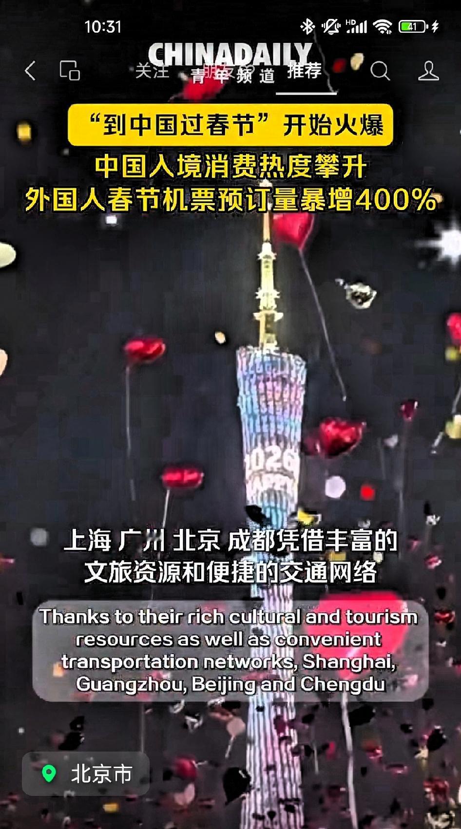 到中国过春节! 随着机票预定量的攀升,“引爆”了到中国过春节的热度,北京,上海,成都,广州都是热点城市。