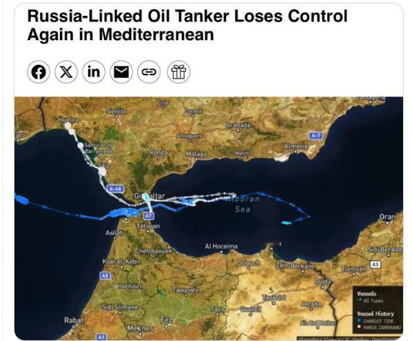 【一艘载有俄罗斯石油的油轮在地中海再次失去控制】据彭博社报道,受欧盟和英国制裁的