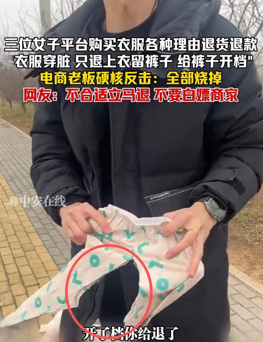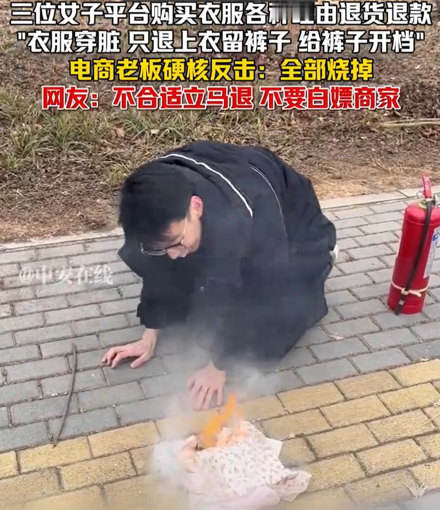 用魔法打败魔法!河南,一位童装网店商家收到三名女客户的退货,虽然理由各不相同,但衣服都已经没办法在卖,商家一气之下,直接在地上“画个圈”,把衣服给烧了。网友:以其人之道,还治其人之身 视频中,网店老板拿着退回来的衣服,直接在网上曝光,三人分别是江苏宿迁的张女士,湖南岳阳的李女士,浙江金华的王女士,三位客户退回来的衣服分别是衣服穿脏了,只退上衣留下裤子,把睡裤裤裆剪掉 如果是商品不合适或者不满意退回,老板也就不说什么了,但这三个退货显然都不合适,而且影响了二次销售 老板一气之下,就把这三件衣服全给烧了,期间他还一直念念有词,这种行为,懂的都懂 对此, 有网友表示:虽然客户的行为不咋样,但老板也没好哪去,只能说双方半斤八两 但也有网友表示:也别怪老板这样,要是质量不行你退回就好了,都穿来了给人退回去,也别怪别人对你不客气 说实话,这个事倒不大,但挺现实的,现在网购方便,退货本是消费者的正当权利,可总有人利用规则的便利,把衣服穿出门甚至弄坏了再退,或者只退一部分,这已经超出了“试穿”或“不满意”的范畴,变成了一种占便宜甚至损人利己的行为 卖家用一种近乎“魔法打败魔法”的土方法,把自己的不满公之于众。这当然不提倡,但也能理解他的无奈:讲理讲不通,规则管不到,那就用最直白甚至粗糙的方式,把这件事“了断”掉,同时也让其他人看看,互相留点体面有多重要 说到底,买卖是双方的事。买家有权退货,但不能滥用权利;卖家应当负责,但也需要被公平对待