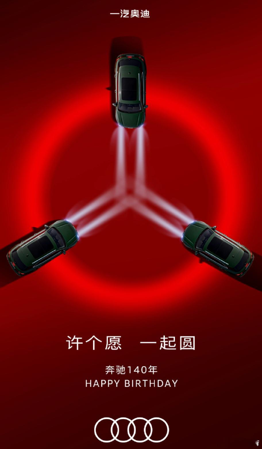 同行祝(蹭)奔驰140岁生日快乐的海报都看完了。最好的还得是老对手奥迪没有蹭的味道、没有刻意传播自己,祝福是真诚的理想玩了一个梗蔚来完成了一个工作其他几家嘛,就那么回事把,心眼子都挺多