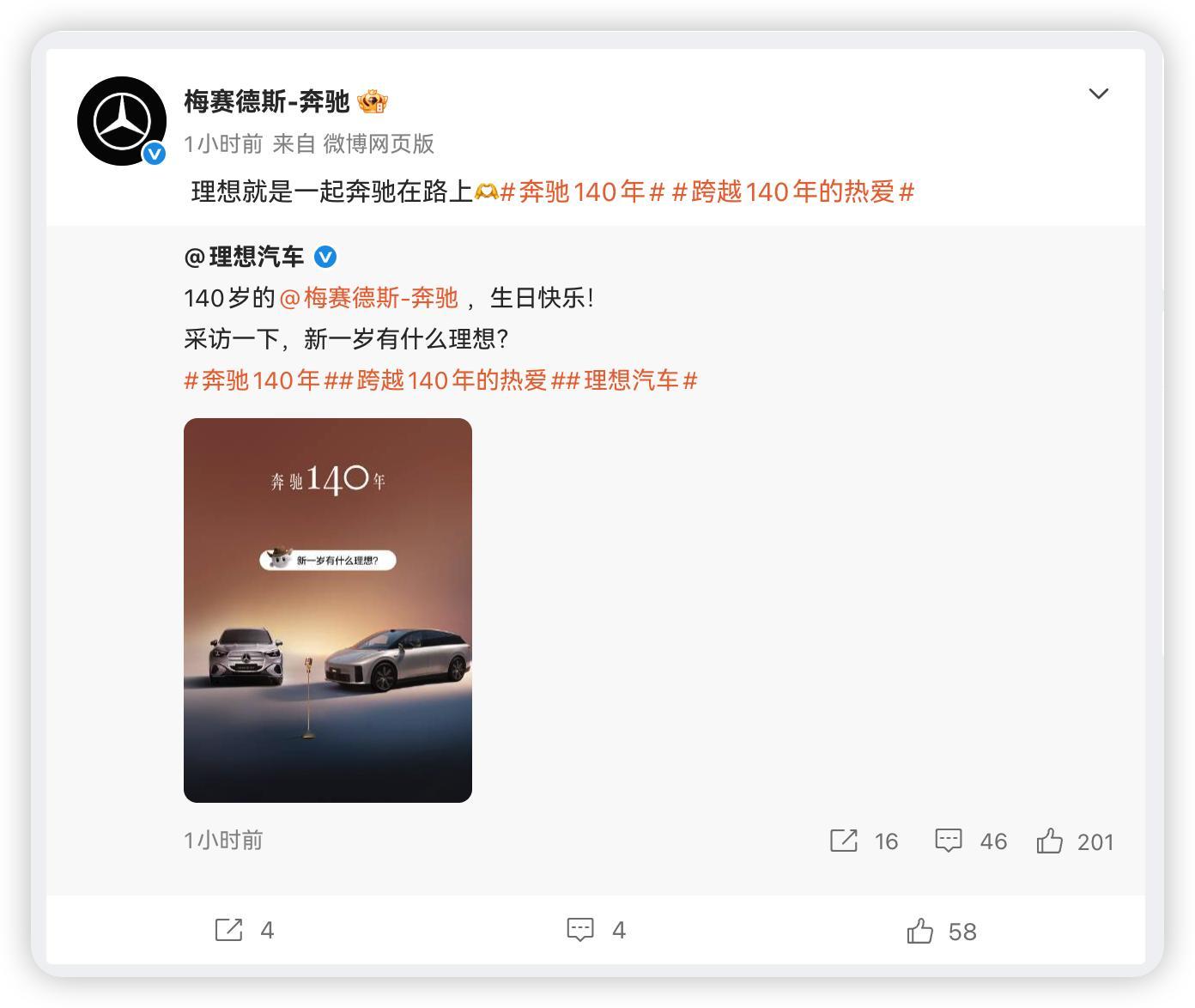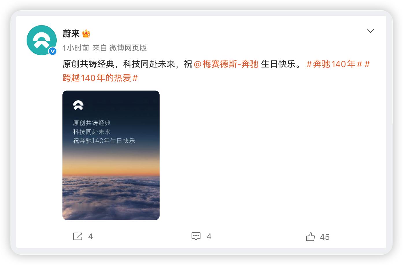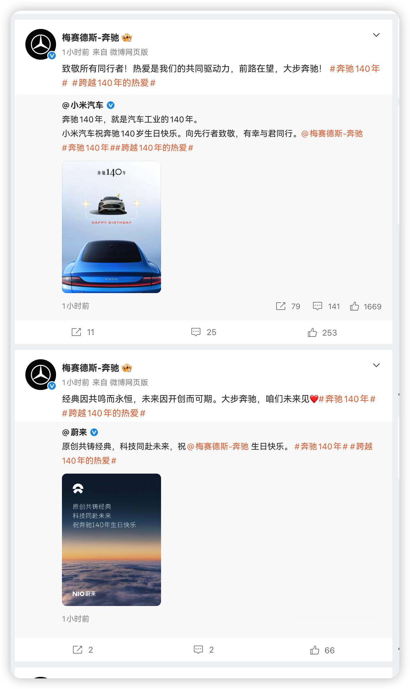 今天车圈这事儿挺体面。小米、蔚来、理想等一众车企全都在祝奔驰140岁生日快乐,奔驰也挨个回礼,气氛难得的和谐。这波操作不光显格局,小米把自己和百年豪门摆在一起,这营销手段也是高明。这种“英雄惜英雄”的场面看着顺眼多了,良性竞争就该是这样。小米汽车祝福奔驰140年 奔驰140年生日快乐