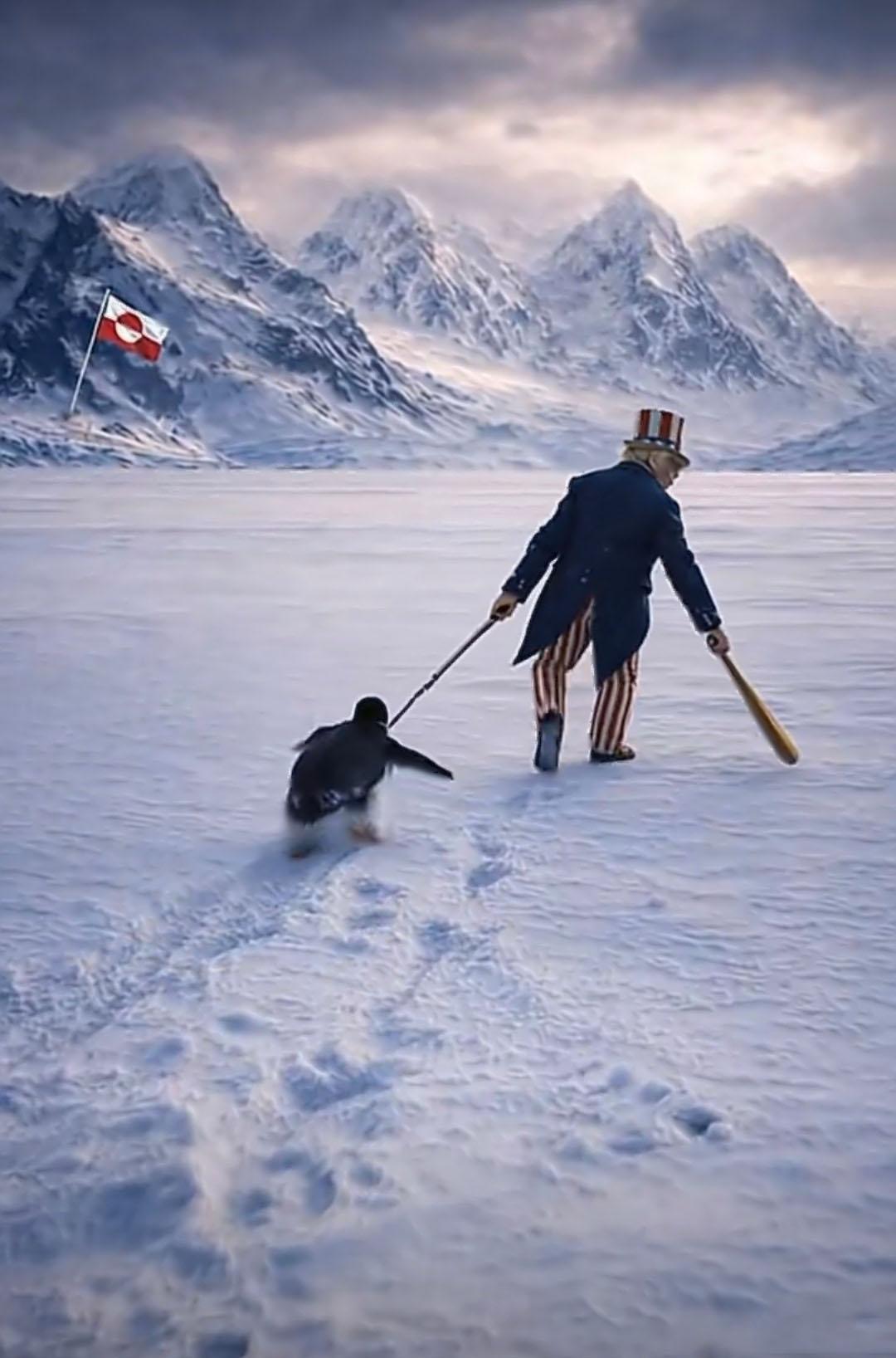 从自愿到被迫就差一根棍子,之前特朗普不断威胁要武力夺取格陵兰岛,甚至白宫还官方发文挑衅。配图是特朗普牵着一只企鹅,企鹅手上还高举美国国旗,双方很开心一起走向格陵兰岛,完全不掩饰占有强抢决心。中方对此进行了二创,发布一条二创小动画:内容是山姆大叔手持棍棒,用绳索拖拽着不愿前行的企鹅,配文:“即使格陵兰岛上有企鹅,情况也会是这样。”在美国人眼中,棍棒更有效,多敲打才能够吓唬人。