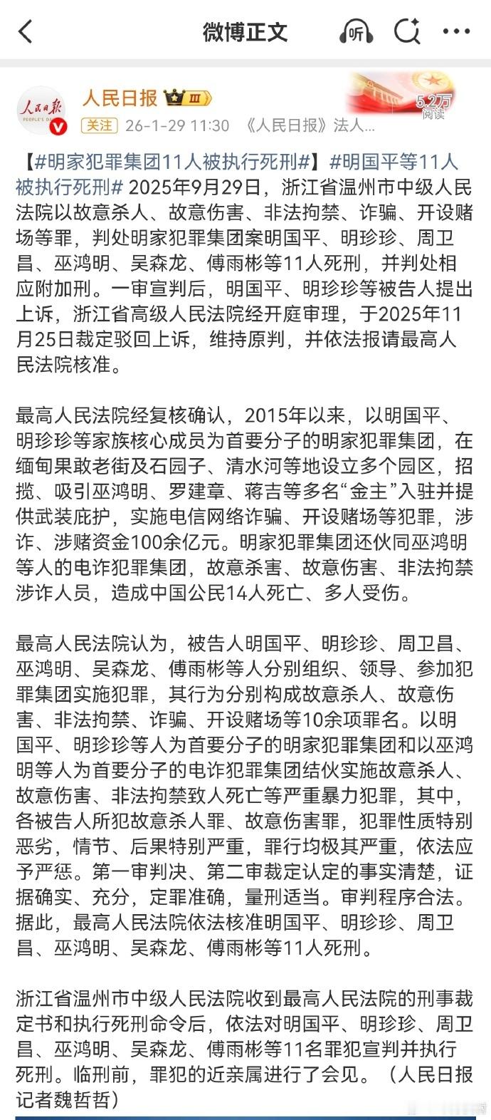 明家犯罪集团11人被执行死刑【明家11人被执行死刑】明家涉案100余亿14名中国人死亡 2025年9月29日,浙江省温州市中级人民法院以故意杀人、故意伤害、非法拘禁、诈骗、开设赌场等罪,判处明家犯罪集团案明国平、明珍珍、周卫昌、巫鸿明、吴森龙、傅雨彬等11人死刑,并判处相应附加刑。一审宣判后,明国平、明珍珍等被告人提出上诉,浙江省高级人民法院经开庭审理,于2025年11月25日裁定驳回上诉,维持原判,并依法报请最高人民法院核准。