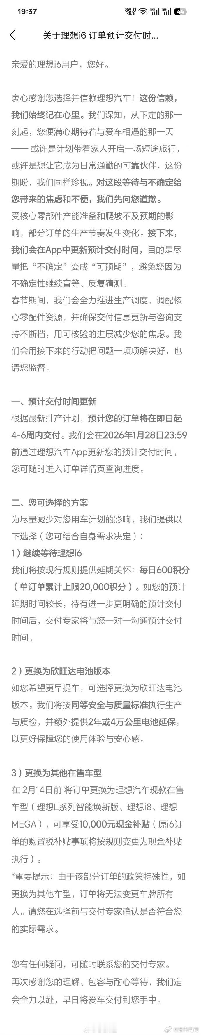 理想官方给出了理想i6 延迟交付的政策:等车,每天600积分换欣旺达电池,提车更快换理想其他车,现金补贴+1万目前理想i6两驱版电池是宁德时代/欣旺达,AB供,四驱是宁德时代电池。多数人选的肯定都是2驱,有准车主分享的订单,之前可以线下约定宁德时代电池。这可能是此次延迟交付的问题,大家觉得宁德时代电池更好、心里更踏实。之前36氪的一个报道,分析过类似情况,尤其是报道中蔚来李斌对小米雷军说的话,非常务实,甚至可以说很“精明”。从个人角度来说,不觉得欣旺达电池和宁德时代电池,在实际用车时有多么大的差距。从供应商角度来说,很多零部件为了保证稳定和低风险,都有1-3个备用供应商,这不是什么新闻,是业内常态。电池有这么多弯弯绕,还是因为它成本相对整车占比高,车企想通过和电池企业合作(理想和欣旺达有出资50:50的厂)降低成本,宁德时代作为行业龙头就是有天然的强势地位。还是李斌对雷军说那句话,搞好关系挺重要。ps,现在电池这些事,相对于20多年前,车企抢三菱发动机太小儿科了。