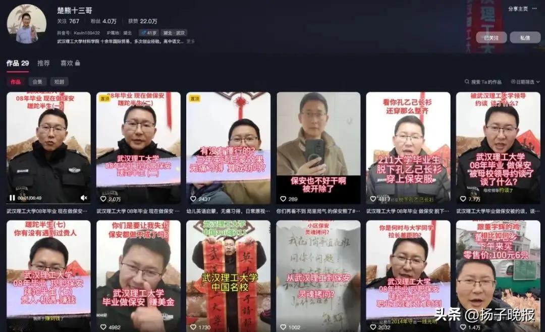 “理科版董宇辉?”湖北武汉,一80后男子名校毕业,创业破产后,失业3年,直接去当了一名保安,他把自己走的“弯路”拍成视频发在网上,妻子是副教授都不嫌他丢脸,没想到,视频几百万点赞,可男子自嘲:视频火了,看客疯了,我被开了。男子保安也做不成了,还被母校约谈,说他抹黑母校。 熊先生是80后,出身农村,家里条件很差,父母对他是放养状态,也不监督他的学习,所以,他属于差等生。 5年级时,熊先生突然变了,开始埋头苦读起来,从来就改头换面,从班级拖后腿的,变成了出类拔萃的好学生。 熊先生一路过关斩将,金榜题名,考进湖北武汉某名校,成为了天之骄子,也是他们村里第一个跳出农门的大学生。 2008年,有考研能力的熊先生放弃了,可能家里条件不好,他决定早点挣钱贴补家用吧。 熊先生进入一家国营车企,端上铁饭碗,这让父母在村里无比风光,但工资却少的可怜,跟进入某家公司,月薪5000-6000的女友比,熊先生相形见绌。 可能这极大的刺激了熊先生的自尊心,女友没有看不起他,他却觉得不能再这样混下去了,他申请去销售部门,这样挣得多一些。 可公司让他稍安勿躁,等待机会,但熊先生等不及,一个冲动就辞职了,决定另谋高就。 辞职后的熊先生起起伏伏,但也挣到钱了,可回头看看,他却得不偿失,因为,当初跟他一起进车企的同学,最后坚持下来,如今都平步青云,成了中层了。 而熊先生虽然挣到了点钱,但失去的更多,谁让他沉不住气呢? 人家立业,他就成家,熊先生把女友娶进家门,也算完成了人生大事,每当他失落时,就劝自己,适合自己的才是最好的,否则即使薪资再高,身居高位他也不快乐。 后来,熊先生瞅准机会,自己创业,注册了公司,也曾一时辉煌,但最后还是破产了。 熊先生失业3年,而此时,妻子已经成了副教授。 最终,熊先生不想这山望着那山高,他决定脚踏实地,2025年,直接拉下面子去做保安,妻子也很支持他。 因为做保安时间多,他就拍视频,分享自己这么多年走过的弯路,还辅导孩子作业,有时候在视频里还说英文,再加上熊先生仪表堂堂,谈吐不凡,他的视频很快就火了。 可万万没想到,他的视频火了,他也失业了,保安都做不成了,很多人质疑他抹黑母校,蹭母校流量、抹黑母校。 据说熊先生还被母校约谈了,但他出来辟谣,学校辅导员跟他取得联系,是关心、问他这么多年的经历没有干干涉他发布视频。 在熊先生看来,他早就过了目空一切,眼高手低的年纪,虽然自己名校毕业,但不是所有有学历的人,人生都会辉煌,很多人都注定普通,当保安就是一份职业,没啥可丢人的,也不存在抹黑。 有人说,我现在和同学差距也大,但好多是自己的选择,怨不得别人,广东有句话:马死落地行。生活且要过,不怨天,不尤人,能赚多少就花多少呗。工资1800,每天笑哈哈。 学历真的不代表能力。挣钱和学历关系不大,这个社会!情商!智商!格局!心态!颜值!要综合!不是书呆子!当前社会不需要高智商的书呆子了! 他读书结婚又生子就业创业自媒体,父母社会需要他干的都干了,创业失败没跳楼没砍人,还能踏踏实实做保安,挺务实心宽的人,还能做自媒体,听追求时代风潮的人,多好啊,不白活,人家媳妇不嫌弃,自己不放弃,挺正能量的啊,干嘛开除? 什么是对?什么是错?在不违反公序良俗和法律法规的前提下,自主选择适合自己当下客观情况的工作来自食其力,是错吗?这个“错”到底是谁定义的?受过高等教育的人很多很多,相比那些专业不对口不愿意干、收入不满意不愿意干、职务没前途不愿意干,然后在家啃老的人,这位选择保安工作的朋友错哪了? 对此,你怎么看?