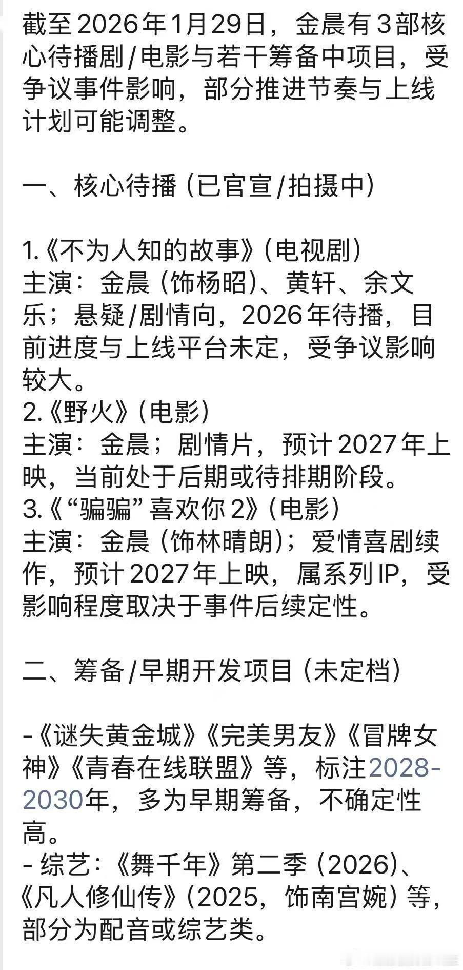 金晨核心待播剧金晨待播项目金晨待播剧会受到影响吗