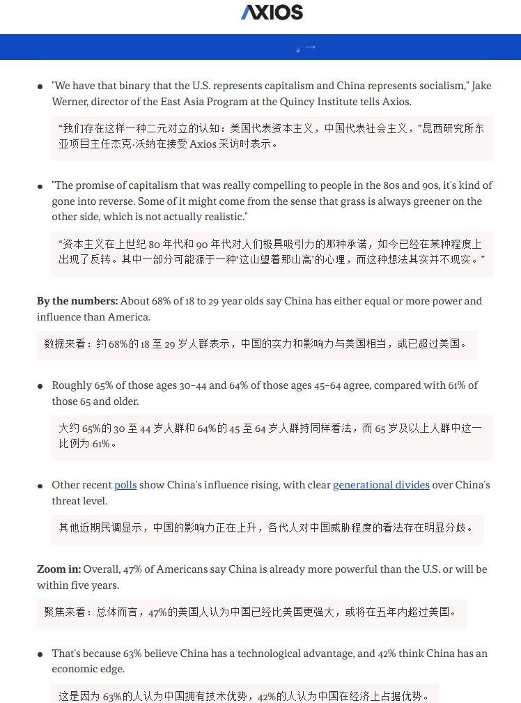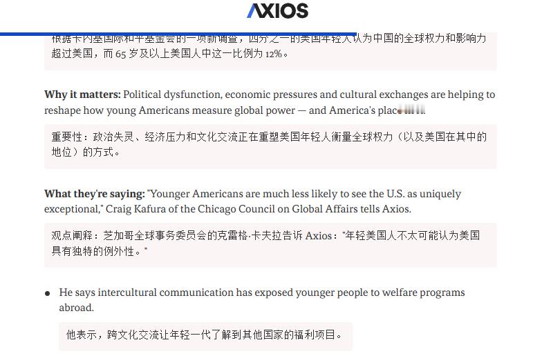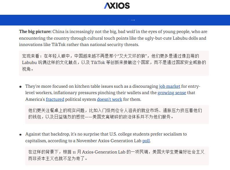 🔻Axios:根据卡内基国际和平基金会的一项新调查,四分之一的美国年轻人认为中国的全球权力和影响力超过美国,而 65 岁及以上美国人中这一比例为 12%。🔻约 68%的 18 至 29 岁美国人群表示,中国的实力和影响力与美国相当,或已超过美国。🔻政治失灵、经济压力和文化交流正在重塑美国年轻人衡量全球权力(以及美国在其中的地位)的方式。🔻芝加哥全球事务委员会的克雷格·卡夫拉告诉 Axios:“年轻美国人不太可能认为美国具有独特的例外性”。他表示,跨文化交流让年轻一代了解到其他国家的福利项目。🔻在美国年轻人眼中,他们更多是通过像丑萌的 Labubu 玩偶这样的文化触点,以及 TikTok 等创新来接触这个中国,而不是通过国家安全威胁的视角。🔻他们更关注美国餐桌上的现实问题,比如入门级岗位令人沮丧的就业市场、通胀压力挤压着他们的钱包,以及日益强烈的感觉——美国支离破碎的政治体系并不为他们服务。🔻在这样的背景下,根据 11 月 Axios-Generation Lab 的一项民调,美国大学生更偏好社会主义而非资本主义也就不足为奇了。🔻总体而言,47%的美国人认为中国已经比美国更强大,或将在五年内超过美国。这是因为 63%的人认为中国拥有技术优势,42%的人认为中国在经济上占据优势。美国的队伍不好带了海外新鲜事热点现场美国打了美国