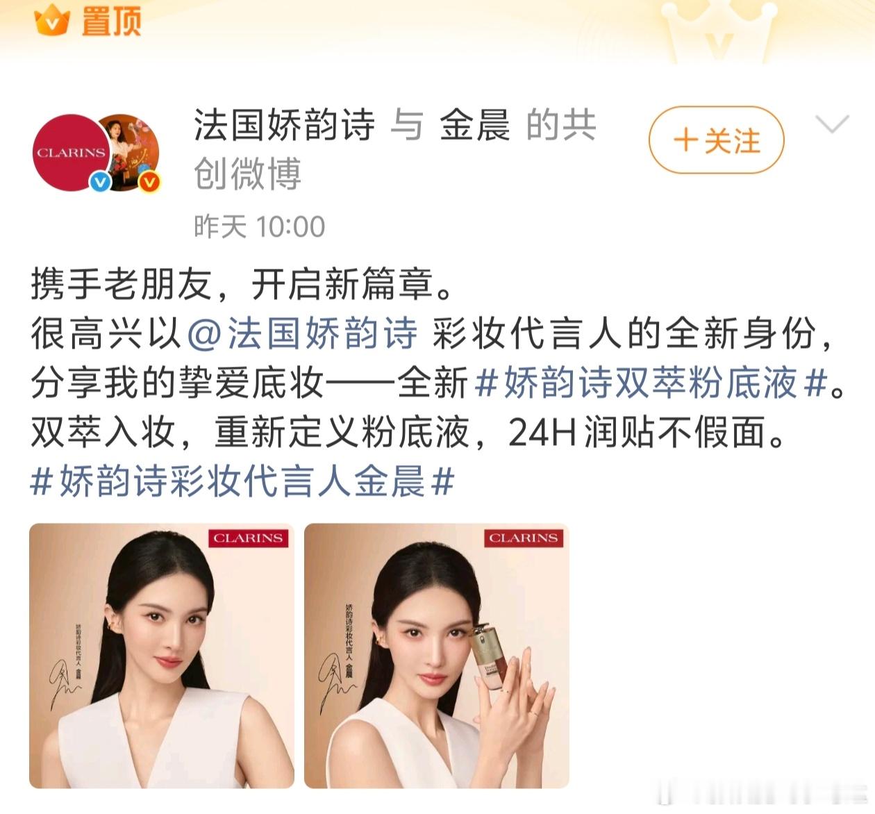 娇韵诗已删除金晨直播预告娇韵诗官方目前还在置顶着昨天官宣金晨的一条博文。而关于金晨在娇韵诗直播呢,因为金晨交通肇事逃逸这事儿闹得,大概率是被取消了。品牌方在金晨尚未辟谣和回应的情况下,也冒不起这个险。