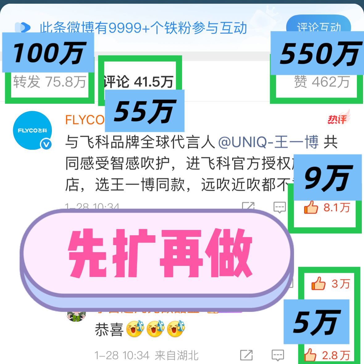 【团见开始】所有人看到一定要扩散,然后开始做!!新代言不允许任何人视而不见!!一周声量天天做,白天找不到人,晚上该来了,点不上就瓶,瓶不了就转,能点几个是几个,都来‼️1️⃣一博飞科官宣博网页链接(👍550万,瓶55万,转100万,一定要边瓶边点)2️⃣星品影响力(好多人没做这个‼️,今天到28万,送心动值,分享出去加一分,一定要分享)王一博飞科品牌全球代言人