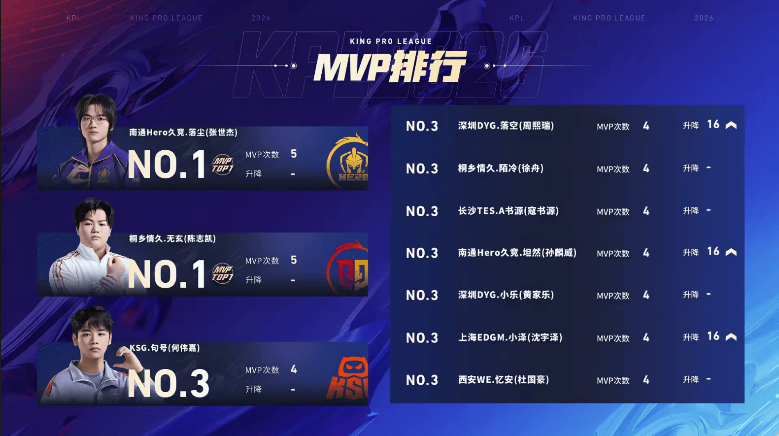 南通Hero久竞_落尘(张世杰)、桐乡情久-无玄(陈志凯)均累计获得5次MVP,并列MVP排行榜首;