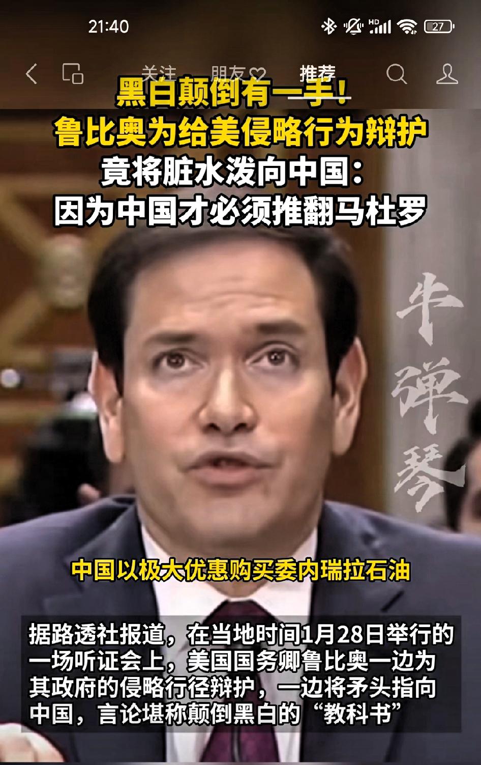 鲁比奥为侵略行为辩护:因为中国才必须推翻马杜罗! 鲁比奥:中国是“马杜罗”政府的核心受益者,能够以极大优惠购买委内瑞拉石油,每桶折扣高达20美元,甚至无需支付现金,直接抵扣借款。如果马杜罗在位,现在发生在委内瑞拉的任何事都不可能实现,其中就包括“削弱中国”的影响力。 编者按:特朗普政府不遗余力的打压中国,把自己对他国的侵略原因归咎到中国身上。正是他们的无理打压制裁,让委内瑞拉人民的生活长期处于贫困之中,现在将自己的野蛮侵略行为转嫁到他国身上,真是令人匪夷所思。