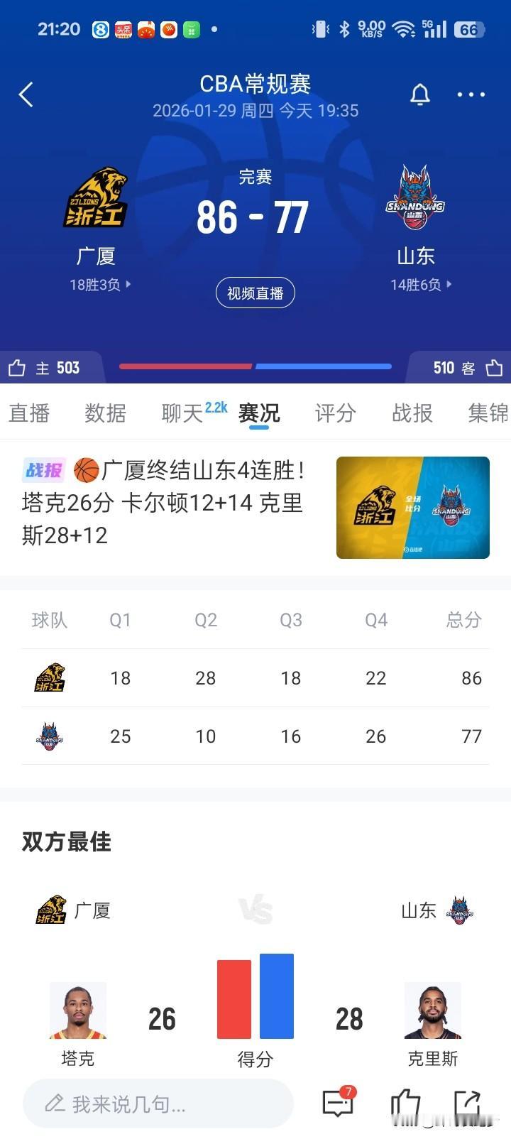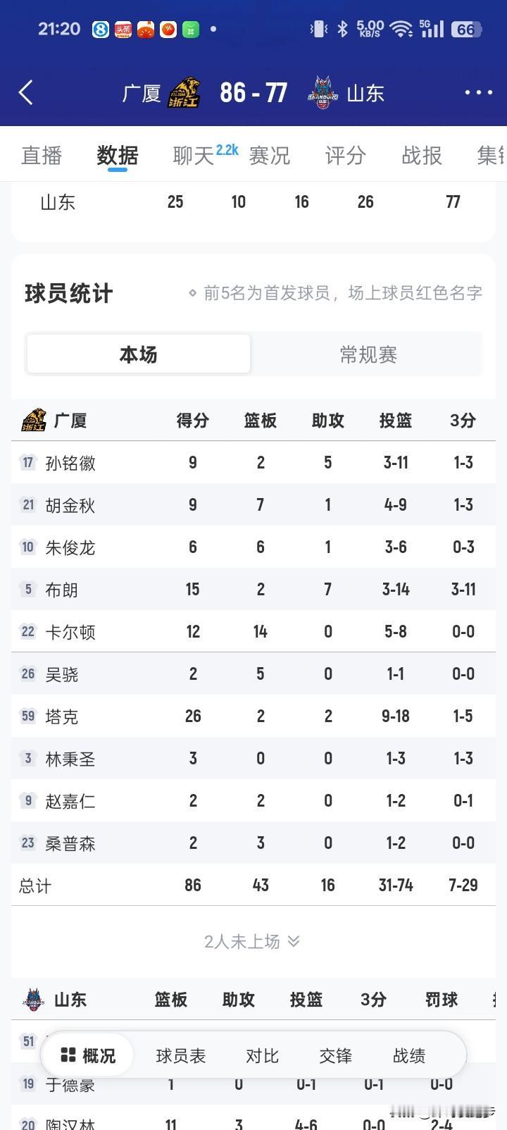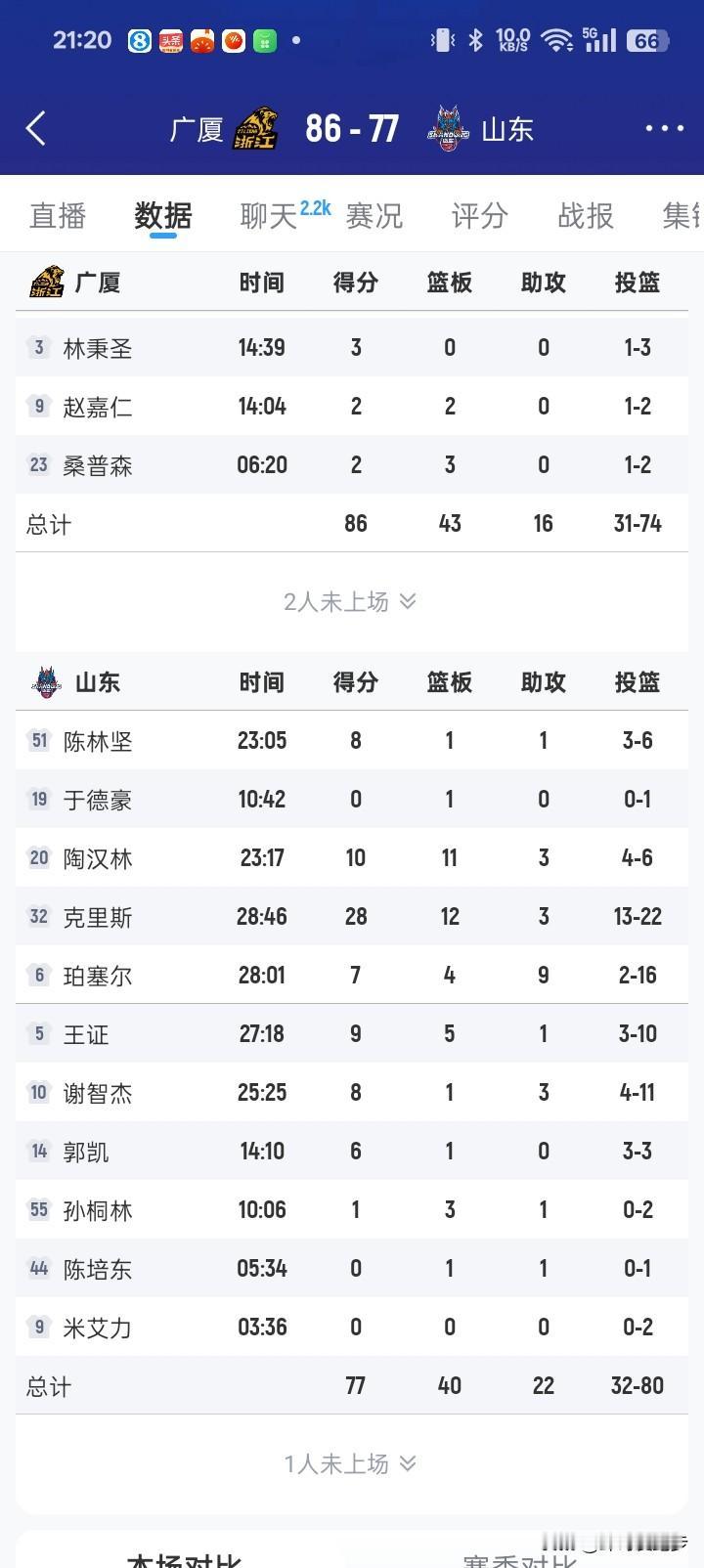 你如果没有看比赛,一看这比分你指定说山东这场打的不错,就输9分!我看了以后我真的发现我们是有机会赢的!浙江是真给机会啊!而我们虽然小高和鲍威尔没打!开场山东打的真好,特别是陶汉林和克里斯,打的真好!第一节山东领先广厦7分!第二节山东失误增多,珀赛尔表现不佳,被广厦打了一个28比10!半场山东落后!第三节山东依然有机会,双方打的又来又往,第三节18比16!第四节一上来,王征来个三分,我们依然有机会,可是邱指导第四节就换了替补阵容,好像是放弃了,但浙江是主力,但是浙江三次回合不进。山东趁机追分!可是邱指导的换人依然让人看不懂!把状态好的克里斯换下,换上珀赛尔!最终还是在客场输了… 邱指导真不应该派米艾力和陈培东上场,几次换人看不懂!关键时刻不陶汉林!反而今天浙江是真给机会,布朗基本没怎么出汗,只得13分!给你机会你中用啊!山东男篮 山东男篮CBA 山东男篮外援 山东队篮球比赛