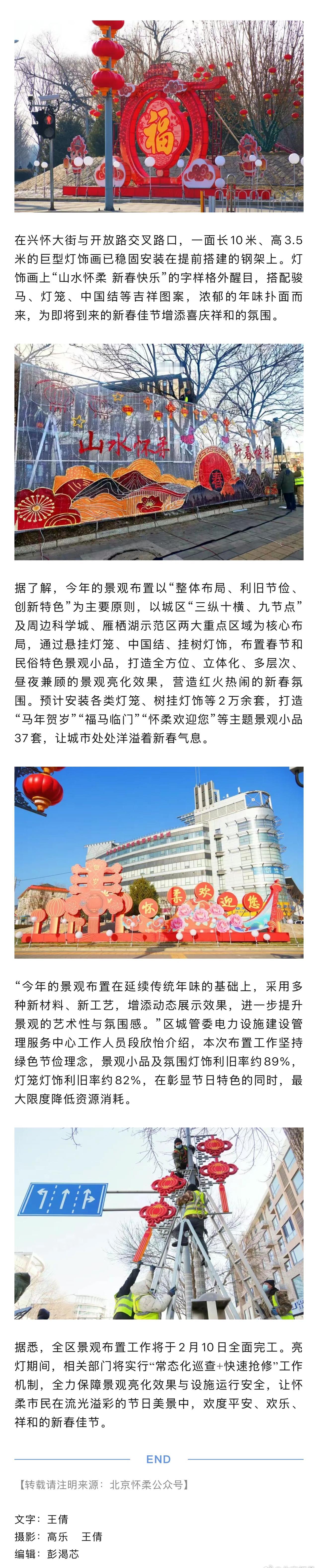 怀柔最美 【“马跃新程、福满怀柔”,2万余套新春景观灯饰小年夜正式点亮】近日,我区启动2026年春节及元宵节景观布置工作,以“马跃新程、福满怀柔”为设计主题,通过灯笼灯饰、发光字、夜景照明等多种形式,打造昼夜兼顾的节日景观,营造喜庆红火的新春氛围。2万余套新春景观灯饰将于2月10日小年夜正式点亮。