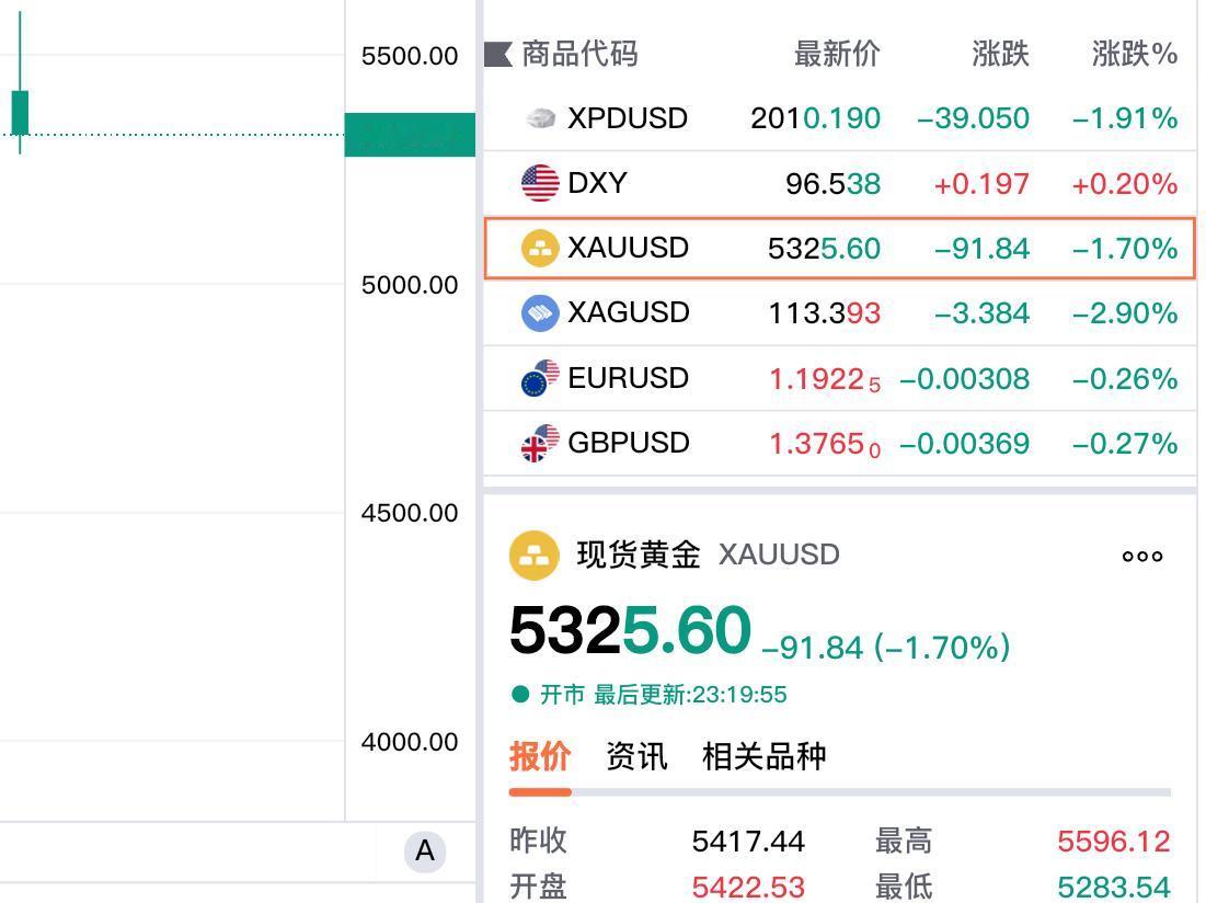 有大涨就有大跌, 金价大幅波动。 这几天黄金疯狂上涨, 期货小褚多次提示风险, 建议大家观望,获利了了结。 今晚现货黄金波动十分剧烈, 冲高回落,波动三四百美元。 现货黄金现价5325.6美元, 较上一日回落91.84美金(跌幅1.7%); 要知道盘中最高是5596美元/盎司, 而且刚刚最低更是探底至5283.54美元。 期货小褚还是建议大家理性!