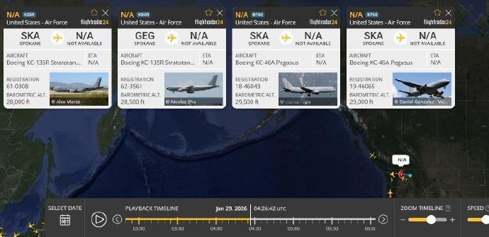 据媒体报道,日前美国空军两架KC-135R“同温层油船”和两架KC-46A“飞马”加油机以紧密编队从华盛顿州费尔柴尔德空军基地起飞。 另有报道称,他们正带着B-52轰炸机调往亚洲。目前尚不清楚调动的B-52轰炸机数量,也未得到证实。