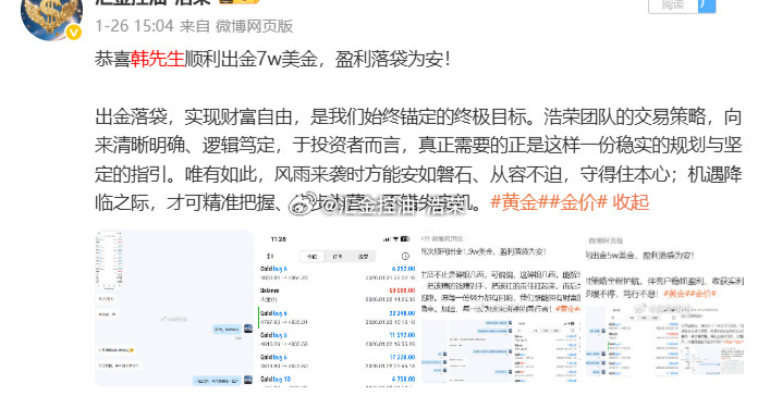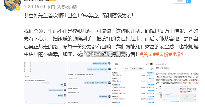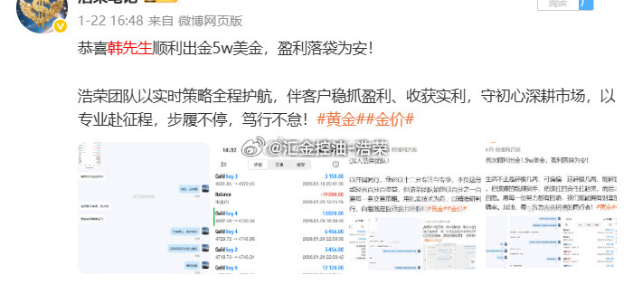 恭喜韩先生顺利出金16w美金,盈利落袋为安!未来的征程,浩荣将继续与韩先生并肩同行,携手冲刺更高目标。期待韩先生一路突破进阶,也愿更多朋友能在浪潮中,找准方向、踏浪前行,收获属于自己的成功!黄金金价