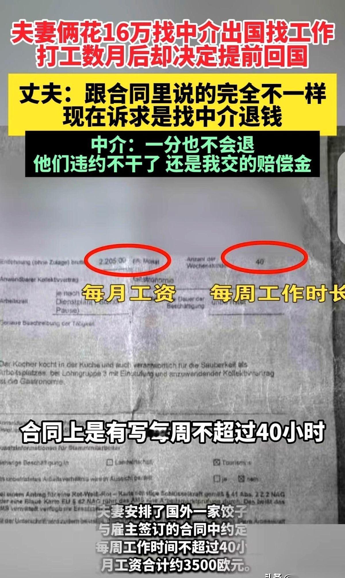 福建三明一对夫妻,揣着16万中介费,登上了去奥地利的飞机。 中介拍着胸脯保证:俩人一个月挣3500欧,换成人民币小三万,每周最多干40小时。 可几个月后,俩人病倒回国,冲进中介办公室要退钱。对面的人翘着二郎腿,把一份文件甩在桌上:“你们违约了,还得赔我7200欧元。” 那16万里,有他们半辈子的积蓄,还有厚着脸皮跟亲戚磕头借来的钱。签合同那天,他们以为抓住了后半生的救命稻草。 宣传册上,奥地利是蓝天白云,花园洋房。对方说,这就是你们以后上班的地方。俩人信了。40来岁,没学历没技术,除了力气一无所有,还能有这种好事?砸锅卖铁也得去。 结果,飞机一落地,梦就碎了。 没有花园,只有机器轰鸣、粉尘漫天的工地。没有“每周40小时”,只有“早上8点到半夜12点”。 整整16个小时。他们每天睁眼就是宿舍发霉的天花板,然后身体就像被焊在机器上,除了吃饭扒拉那几分钟,一直转到深夜。回到床上,脑子里只剩一片嗡嗡的空白,连话都说不出来。 赚的那点钱,还不够付医药费。身体先扛不住了,再干下去,命可能就交代在那了。 俩人一商量,买票,回家。 他们拖着一身病,坐在中介办公室里。空调冷风飕飕地吹,可夫妻俩后背全是汗。 他们只想拿回那16万。 对面的中介慢悠悠地开口,不谈工时,不谈病痛,只谈合同。“你们自己跑回来的,算单方面违约。”他指着那份7200欧元的单据,说这是赔给奥地利雇主的违约金,没让你们掏,已经算仁慈了。 夫妻俩对视一眼,嘴巴张了张,一个字都没说出来。 原来这是一个死循环。你留在那里,就是被活活榨干。你跑回来,就是“违约”,钱一分没有,甚至还要倒赔。 横竖,都是被收割的命。 所以这16万,到底是交给出国的“中介费”,还是买一张“认清现实”的船票?