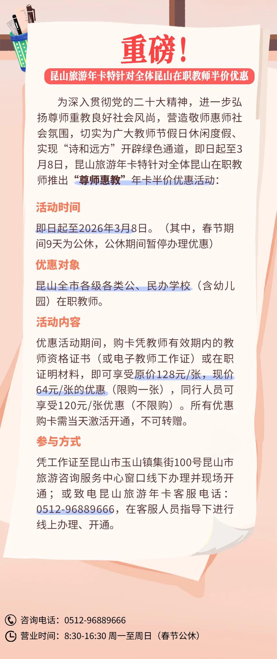 好消息!昆山教师朋友们有专属福利啦~刚看到官方通知,昆山面向全市在职教师推出旅游年卡半价优惠,真心觉得这个举措挺贴心的! 简单来说就是: 即日起到2026年3月8日,只要是昆山公、民办学校(包括幼儿园)的在职老师,就可以用 64元 买到原价128元的昆山旅游年卡,相当于直接打对折!家里人或朋友如果想一起办,也可以享受优惠价120元/张。 怎么办理呢? · 带好你的教师资格证(或者电子工作证、在职证明),去昆山市玉山镇集街100号的旅游咨询服务中心窗口直接办,现场就能开通; · 或者打电话 0512-96889666,在客服指导下线上办理,也很方便。 需要注意的几点: · 每人限办一张优惠卡,且必须当天激活,不能转赠哦; · 春节有9天公休(具体时间建议电话确认),那期间办不了,别跑空; · 服务中心营业时间是每天8:30-16:30,周一至周日都开(除了春节公休)。 我个人觉得,教师平时工作挺辛苦的,能有这样的本地文旅优惠还挺实在的。年卡应该能覆盖不少景点,周末或假期带孩子、家人出门转转,既放松又省钱。有需要的老师可以抓紧看看证件是否在手,趁着活动结束前办下来~ 注:具体办理材料及公休日期,建议以官方最新说明或电话咨询为准哦。
