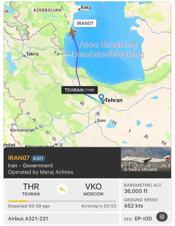【一架由伊朗梅拉吉航空公司运营的飞机(尾号EP-IPD),通常用于运送伊朗高级官员,已从德黑兰飞往莫斯科。】