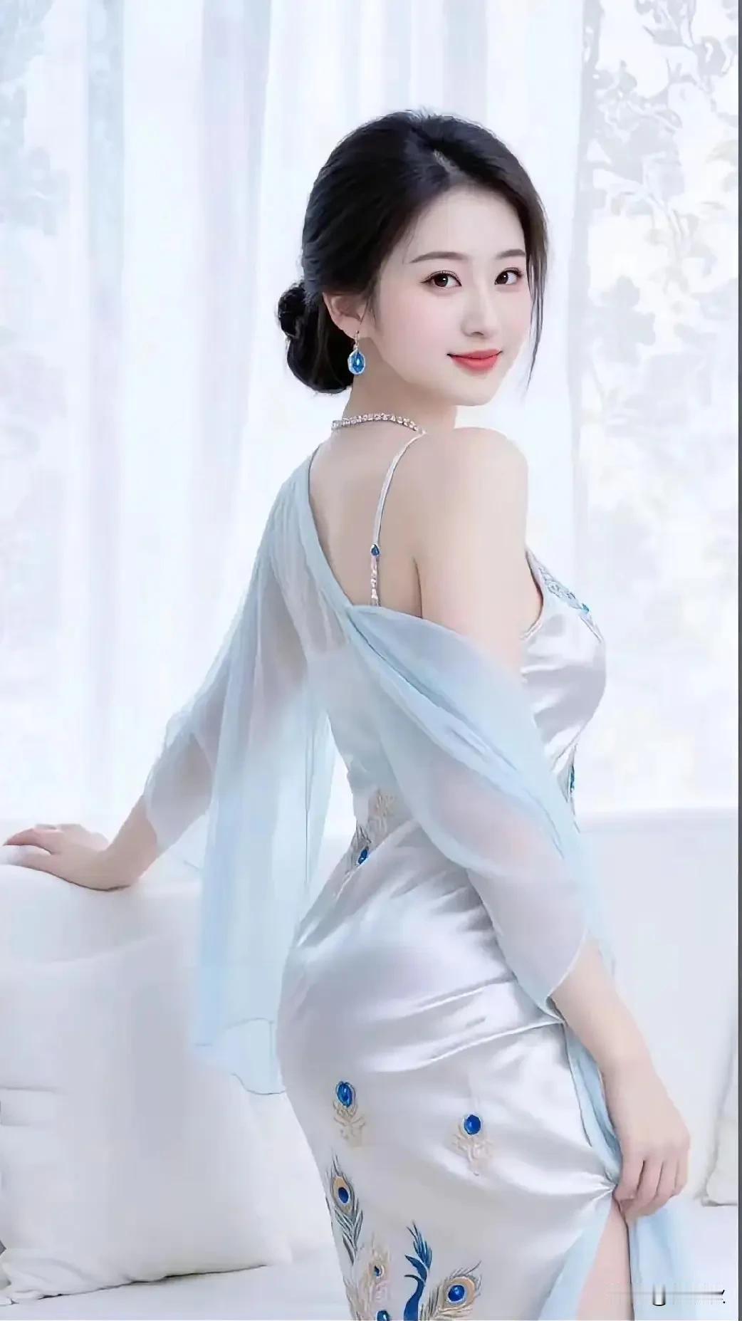 白色旗袍雅韵生, 恰如写意山水中。 贴身裁剪显性感, 宛若清水出芙蓉。