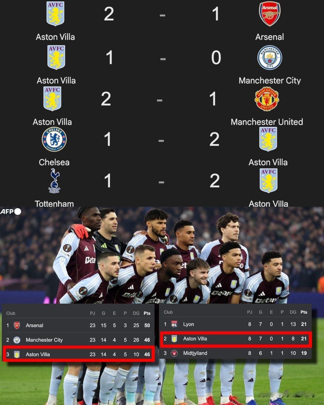 请全体起立,为阿斯顿维拉献上掌声!他们本赛季至今的表现: ✅ 稳居英超联赛前三名 ✅ 正直接争夺英超冠军 ✅ 欧联杯小组赛挺进前三 ✅ 直通欧联杯十六强淘汰赛 ✅ 晋级足总杯第四轮 ✅ 已击败阿森纳 ✅ 已击败曼城 ✅ 已击败曼联 ✅ 已击败切尔西 ✅ 已击败热刺 他们屡克强敌,正在角逐世界顶级的联赛冠军;欧联杯8场取得7胜;进入二月仍保持三项赛事的争冠可能!埃梅里打造了一支多么出色的球队。 英超乃至全英伦的热门焦点!