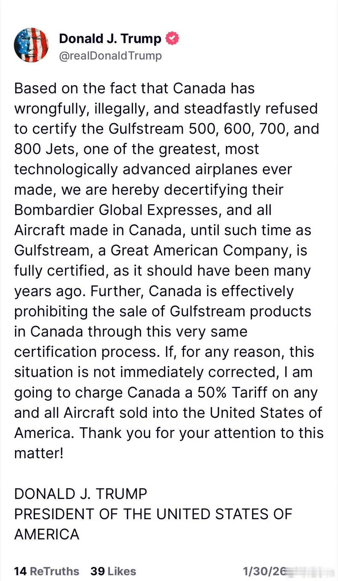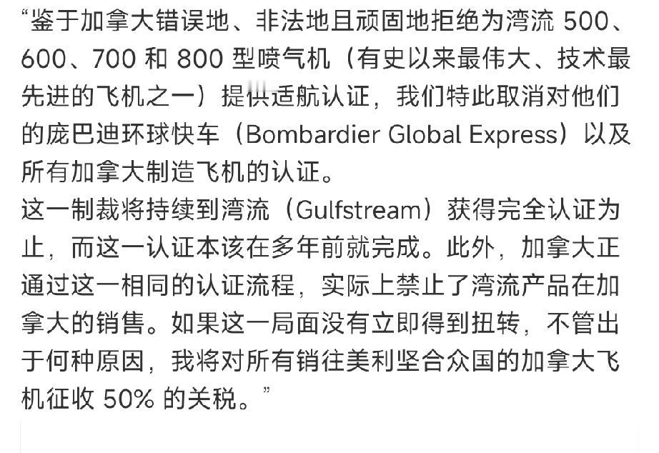 加拿大飞机不准进入美国领空! 1月30日,特朗普以加拿大不为美国湾流飞机提供适航认证为由,一怒之下“取消所有加拿大制造的飞机认证”: 也就是说,今天起全球所有加拿大制造的飞机再不也能进入美国领空了! 之前中加协议引起特朗普不满,这次就是对加拿大的重拳出击。