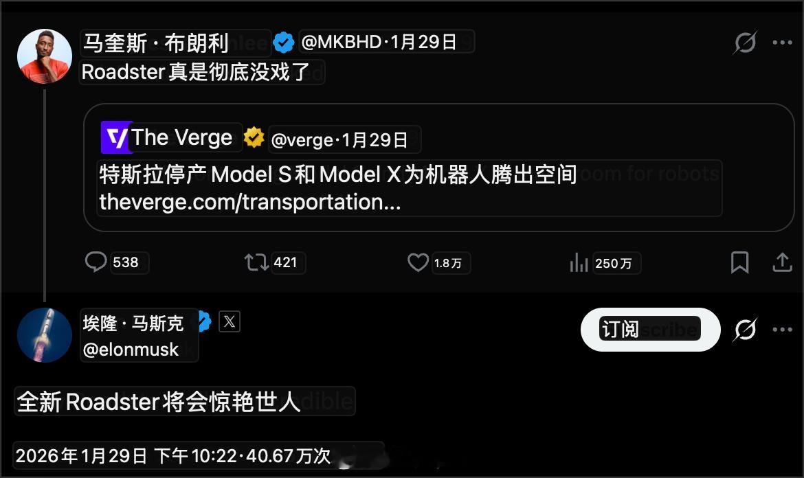 MKBHD:Roadster 看来没戏了!马斯克 :新款Roadster将令人惊叹!特斯拉