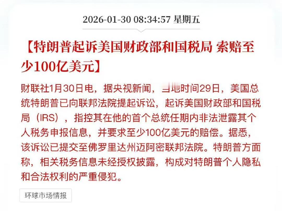 特朗普又盯上了100亿美元…… 1月29日,特朗普因美国财政局和税务局未经其同意私自泄露个人税务申报信息而发起起诉: 要求美财政局税务局赔偿至少100亿美元! 这是特朗普上任以来提出的最大一笔赔偿金,之前曾起诉摩根大通赔偿50亿美元。