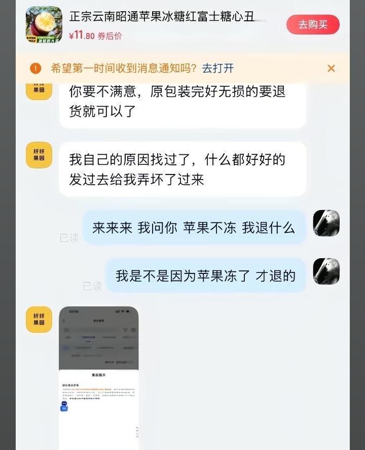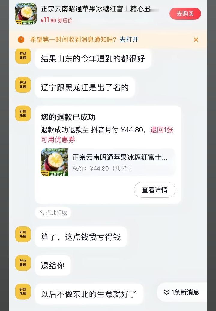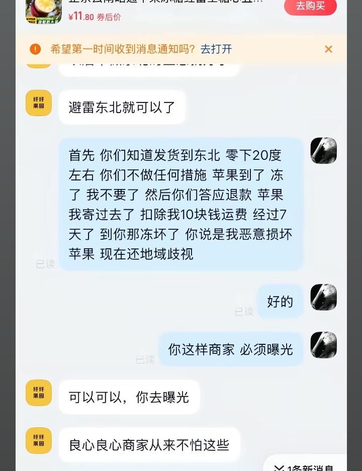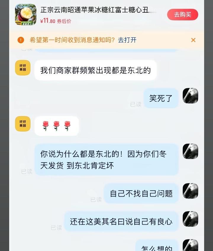 避雷东北?又见地域黑,作为东北人我真看不下去了。 一东北网友买了箱苹果,买之前确认了东北可以发货。结果到了发现苹果冻坏了,商家说忘用保温袋了。 苹果不能吃,那就退吧,退货过程都挺顺利的,原封不动退的货,网友还自己搭了8块运费。 结果最后商家收到货后来节目了,打开箱子一看苹果坏了,要扣网友钱,网友说那是冻坏的,商家不认可,并且开始地域黑。 商家称在他们圈子里,东北人出了名的事多,要避雷东北,以后不做东北人生意,还认为这苹果是网友故意弄坏的,让网友随便曝光。 稍微有点常识的人都能看得出来,商家收货照片里的苹果是冻了以后、又解冻自然出现的凹陷,并非人为造成的。 东北零下20多度,苹果能不能卖、能不能运输作为商家不清楚?口口声声称东北人退货多,都冻了还不退?好一个混淆是非。 既然搞地域黑,那网友们也不客气了,直接攻陷了这家店的评论区,这下别说东北的生意,恐怕全国的生意都不好做了,毕竟谁是谁非,大家看的明白。地域黑