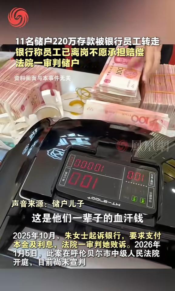 “太荒唐了!”内蒙古呼伦贝尔,女子去存75万元,是在窗口办理的,在不知情的情况下,她的钱汇到了别人的卡,她的75万,被柜台里的工作人员转走了,受害人有11个,一共被转走了220多万,他们去讨个说法,却被告知这个工作人员已经离岗了,女子去起诉,让女子意想不到的事情发生了。 内蒙古呼伦贝尔一起诈骗案,让不少人看了都揪心。   朱女士把自己一辈子省下来的75万养老钱,存到了银行,到最后却一分不剩,找来找去,钱没追回来,还落得个起诉败诉的结果。   朱女士今年年纪不小了,一辈子没享过什么福,省吃俭用才积攒了75万元,想着给自己留个后路,以后养老、看病不用麻烦别人。   那天,她把钱仔细包好,又带上自己的银行卡和身份证,去了家附近一家她觉得信得过的银行。   那天银行的人不算少,她排了快一个小时的队,才终于轮到自己。   到了柜台,她把现金、银行卡和身份证一起递进去,又反复跟当时的柜员孟某交代,说要存定期,一定要帮她核对好信息。   孟某看着挺热情,笑着让她别担心,说肯定帮她办妥当,然后就开始清点现金,手指在键盘上敲个不停,偶尔会递一张单据过来,让朱女士签字、按手印。   朱女士没怎么去过银行,对这些流程一窍不通,她觉得银行工作人员都是专业的,而且这么大的银行,肯定不会出问题,所以孟某让她做什么,她就乖乖做什么,没有半点防备。   大概十几分钟后,孟某把银行卡和一张存款单据递了回来,说钱已经存好了,让她把单据收好,以后取钱的时候能用得上。   朱女士接过东西,核对了一下信息,放心地把银行卡和单据收好,满意地走了。   之后的一段时间,朱女士从来没查过自己的账户余额,在她心里,钱存进了银行,就跟放进了保险柜一样安全,根本不用操心。   直到一个多月后,家里需要买点生活用品,还得给老伴买些常用药,朱女士才想起去银行取点钱。   她走到ATM机前,把银行卡插进去,输入密码,可屏幕上显示的余额,让她瞬间僵在了原地,余额是零。   她以为是自己输错了密码,又重新输了一遍,结果还是一样;她又换了一台ATM机,反复查了好几次,可账户里依旧一分钱都没有。   朱女士的脑子一下子就空了,浑身直冒冷汗,手里的银行卡都差点掉在地上,她怎么也想不明白,自己明明存进去的75万,怎么会凭空消失。   她急急忙忙跑到那家银行,找到工作人员一个劲地追问自己的钱去哪了。   工作人员一开始还,说帮她查一查,可查了很久,也没给出个明确的说法,只说可能是系统出了问题,让她再等等。   就在朱女士急得团团转的时候,她听到银行大厅里还有其他人在争吵,仔细一听才知道,那些人也跟她一样,在这家银行存的钱不见了。   大家凑到一起一聊,才发现所有人都是在同一个窗口办理的存款业务,接待他们的都是同一个柜员,也就是孟某。   他们慢慢核对情况,最后发现,一共有11名储户被骗,被骗的金额有多有少,加起来足足有220多万,其中朱女士被骗的75万是最多的。   她和其他受害者一起,找到银行的负责人讨说法,可负责人的态度特别冷漠,说孟某已经从银行离职了,而且这是孟某的个人行为,跟银行没有关系,让他们自己去找孟某要钱。   更让人无奈的是,孟某离职后就彻底失联了,没人能联系上他,而且他已经把骗来的220多万全部挥霍一空,就算找到他,他也无力赔偿。   后来大家才知道,孟某因为诈骗罪已经被判了刑,可判刑也没用,钱还是追不回来。   走投无路之下,朱女士聘请了律师,把这家银行告上了法庭,她觉得,孟某是银行的员工,是在工作期间骗的钱,银行没有尽到监管责任,就应该承担赔偿责任。   朱女士满心以为,自己占着理,官司肯定能赢,可一审判决下来,她却败诉了。   一审败诉后,朱女士没有放弃,她决定继续上诉,可她心里也没底,这笔钱到底能不能要回来,她也不知道。   按照法律规定,商业银行本来就有义务保障储户的合法权益,孟某在工作期间利用职务之便实施诈骗,银行的监管肯定存在漏洞。   很多网友看到这件事,也都替朱女士打抱不平,觉得银行不能一句“员工个人行为”就撇清所有责任,监管不到位,就应该承担相应的后果。   现在,朱女士的上诉还在进行中,大家都盼着二审的宣判能还她一个公道,盼着她能追回自己的血汗钱。   可说实话,难度真的很大,孟某无力赔偿,银行又拒不负责,一个普通老百姓,想要和银行抗衡,真的太不容易了。   没人知道,朱女士的75万养老钱,最后能不能找回来,也没人知道,这些受害者,能不能等到一个满意的结果。