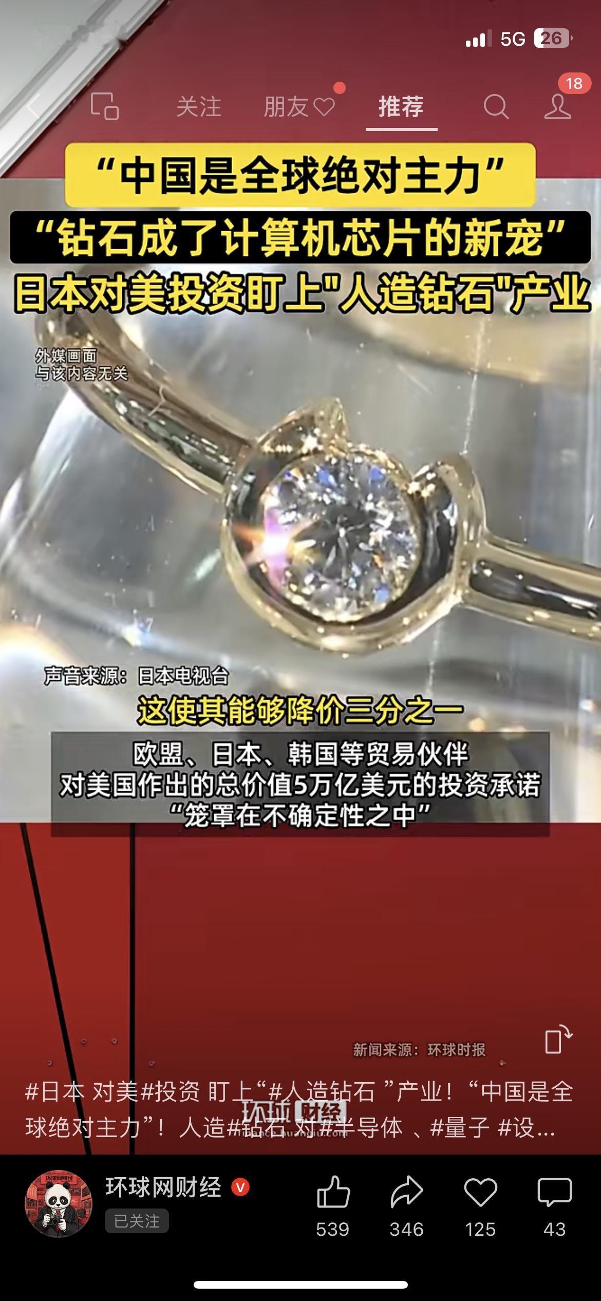 中国造人造钻石几乎垄断全球,日本突然要去美国抢生意? 最近日本对美投资的首批项目里,就有人造钻石,想帮美国摆脱对咱们的依赖! 咱国内的人造钻石,不管是技术还是成本,都拿捏得死死的,这波他们想超车太难了! 你觉得人造钻石会变成下一个科技博弈的热点吗? 人造钻石 财经热点 日本对美投资 市场有风险,投资需谨慎